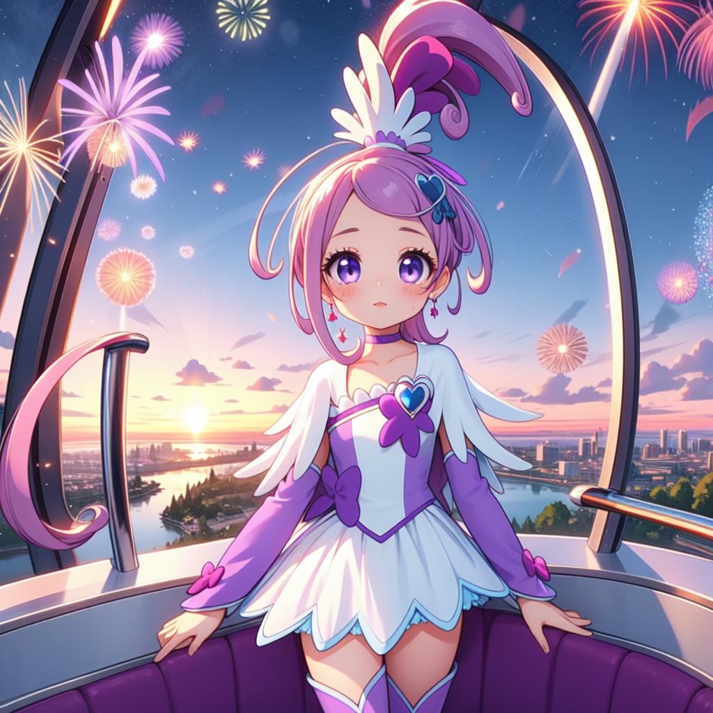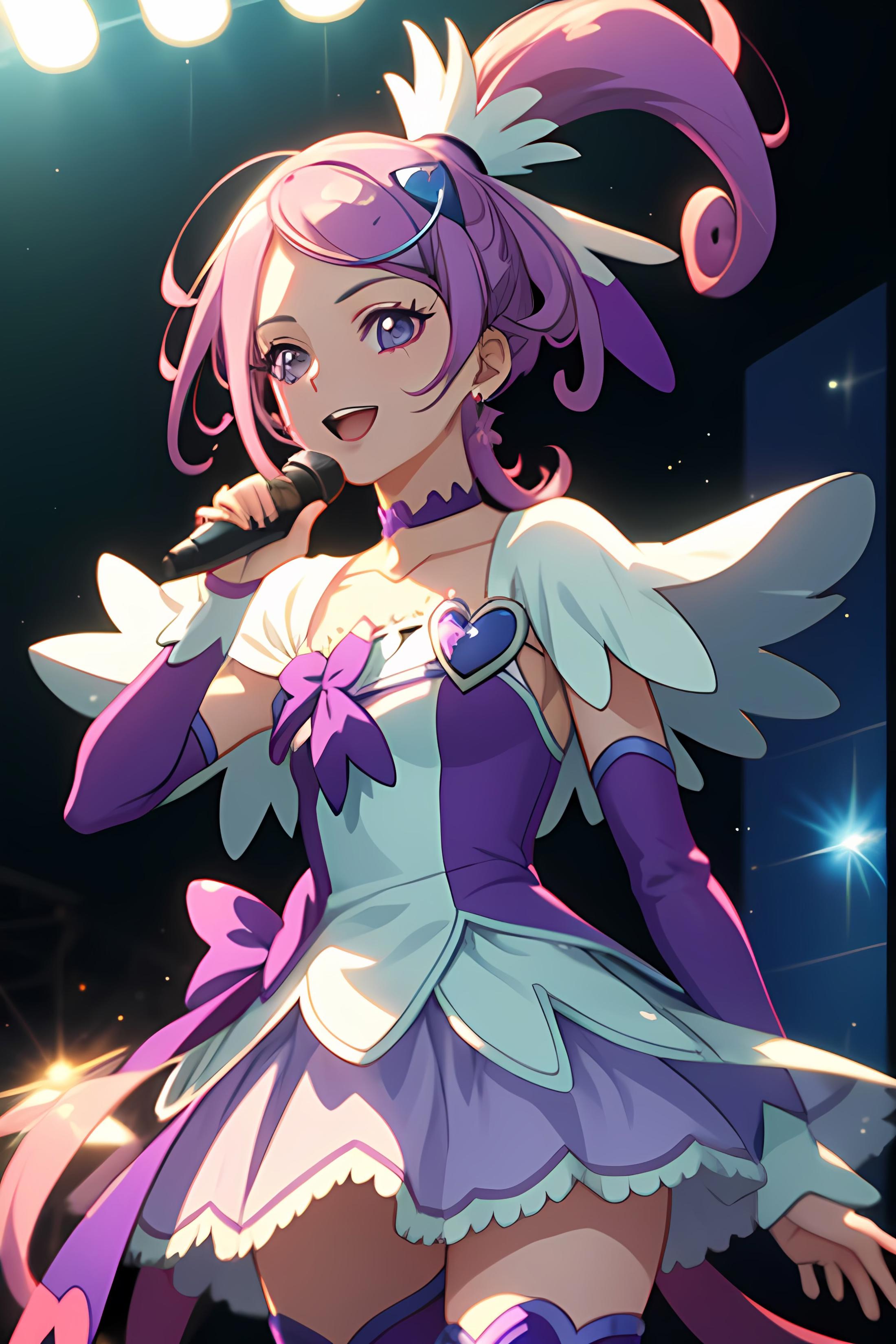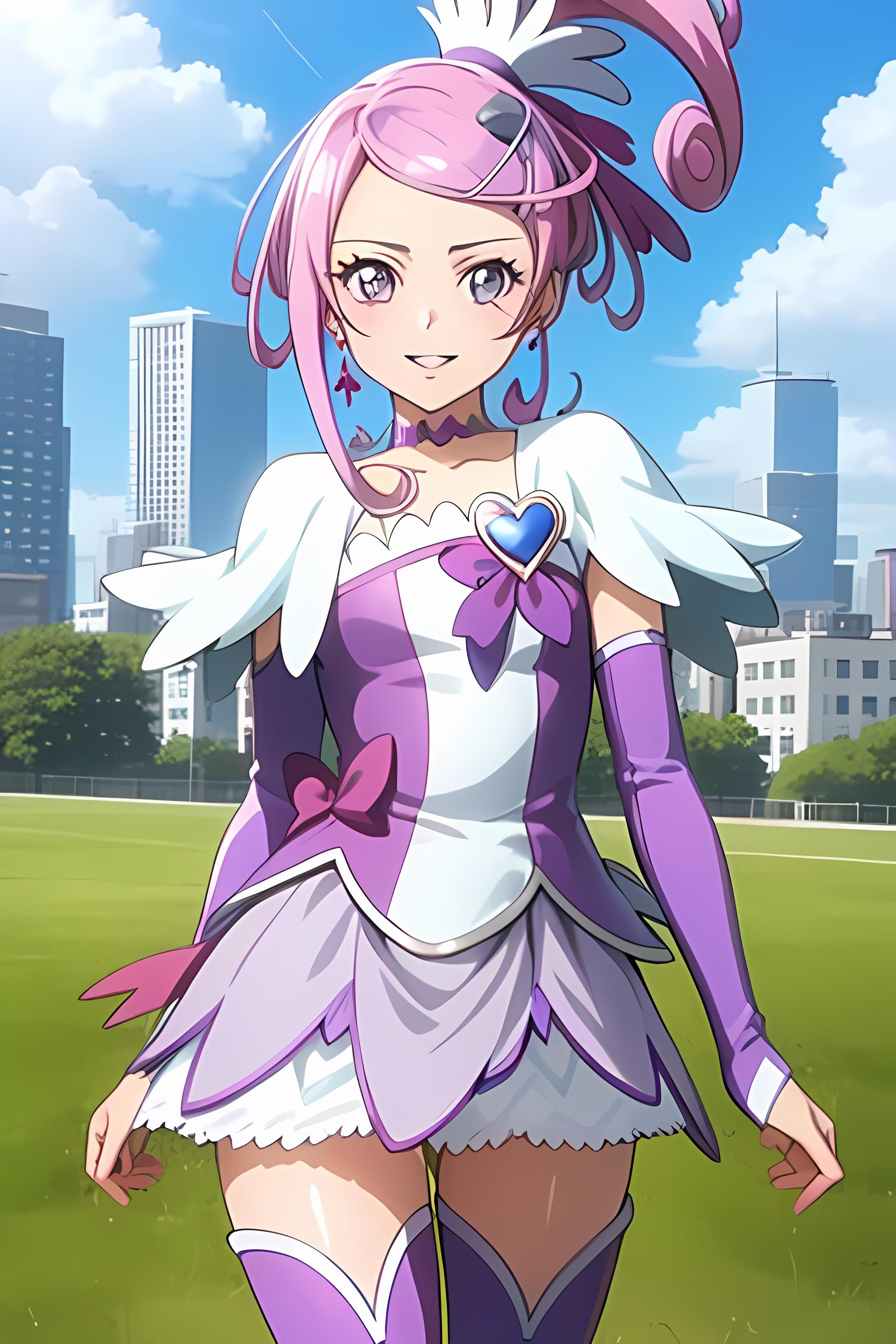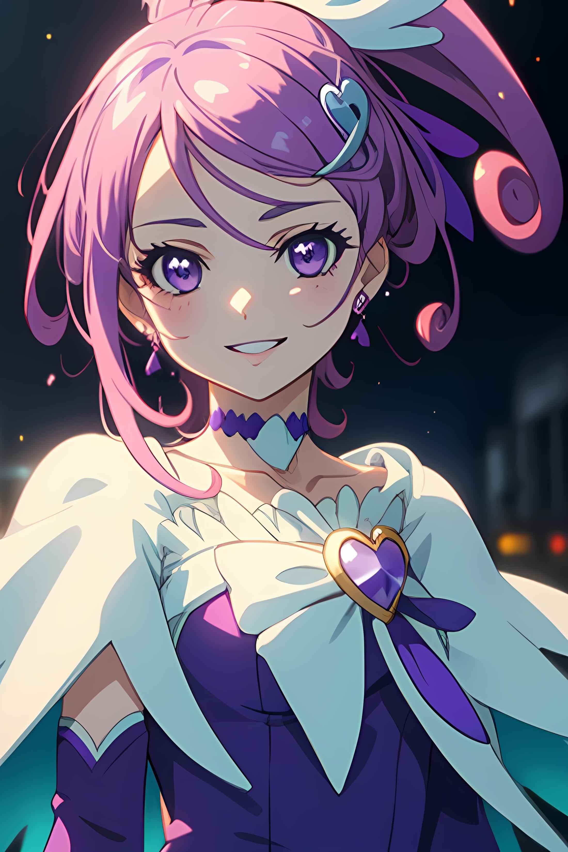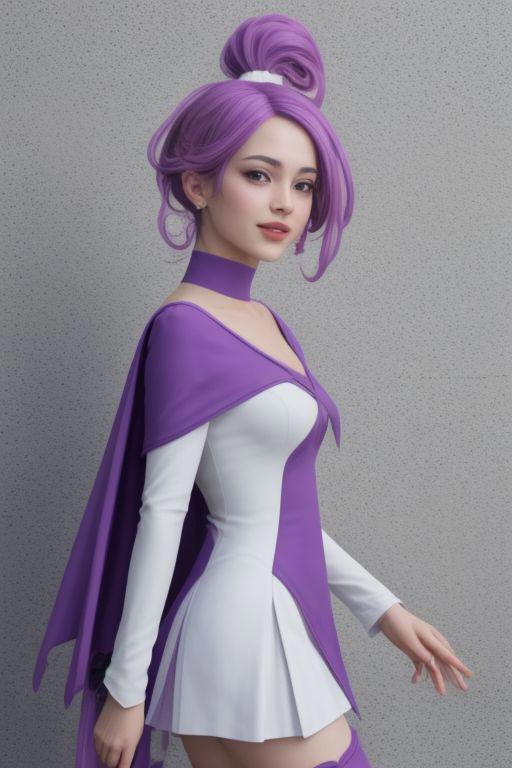 purple dress, spade hair ornament, purple thigh boots, high ponytail, detached sleeves, arm warmers, hairpin, capelet, choker, heart brooch:0.6