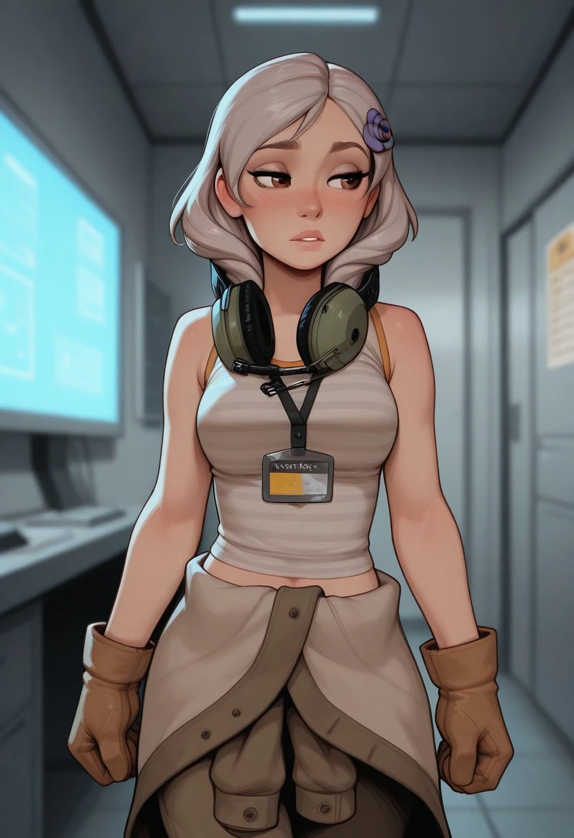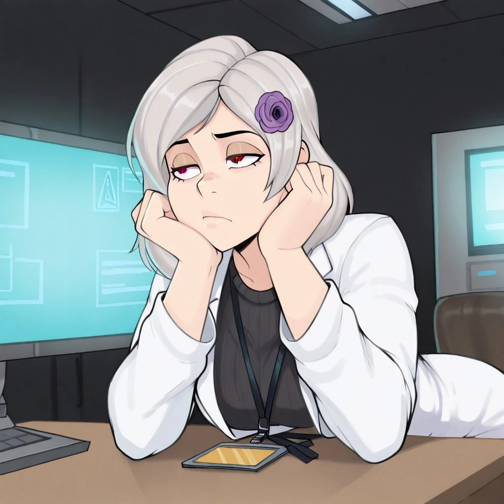 SunnyMGR, silver hair, brown eyes, hair flower