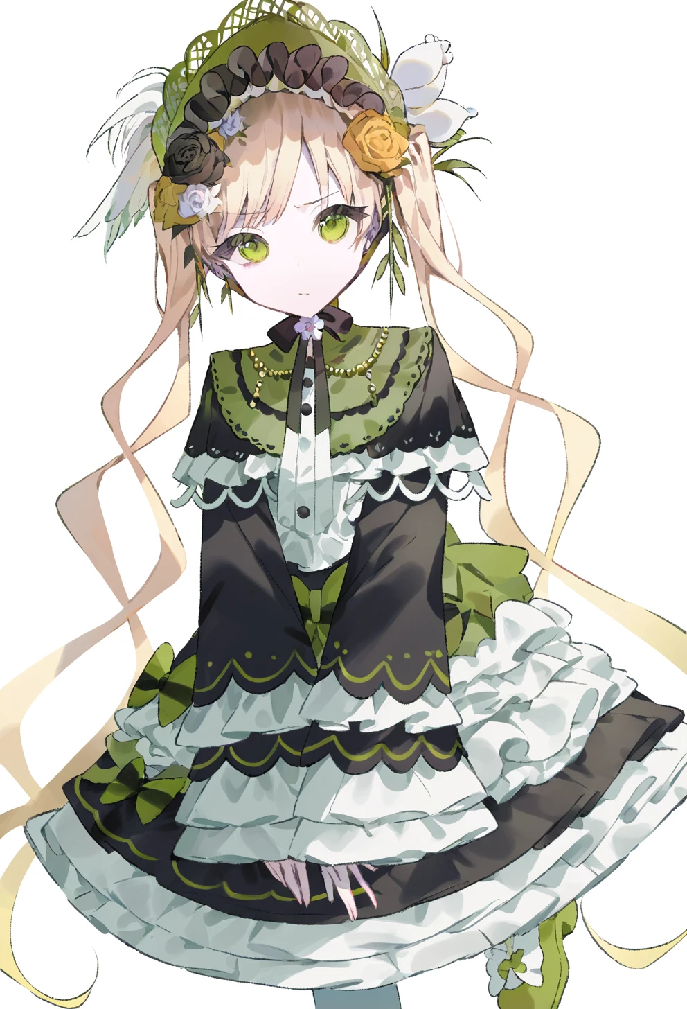 toono hanna, 1girl,blonde hair, very long hair, twintails, green eyes, lolita fashion, black dress, green dress, frilled dress, bonnet, black footwear, green footwear,hair ornament, hair flower, green bow多人图只需要将多人提示词同时使用,详细参考例图
