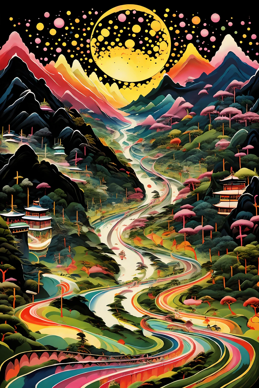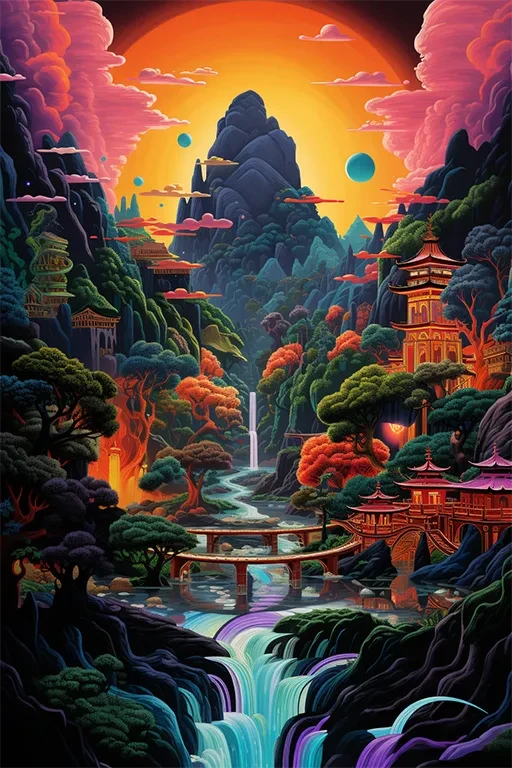 中国风2D插画,炫彩山水,建筑