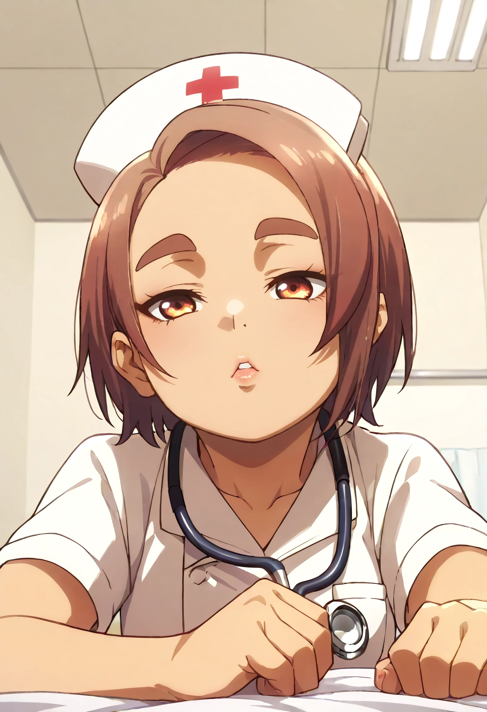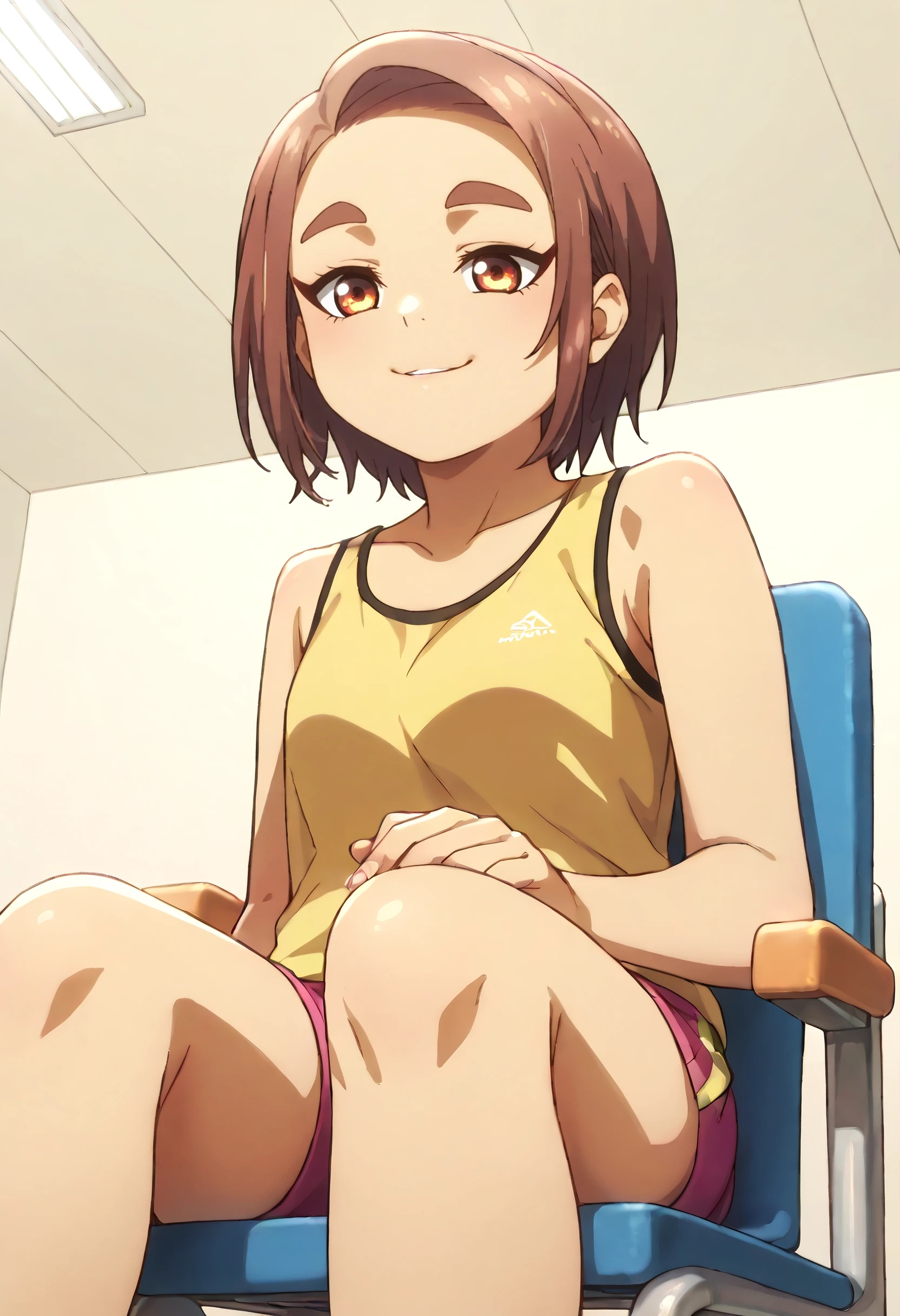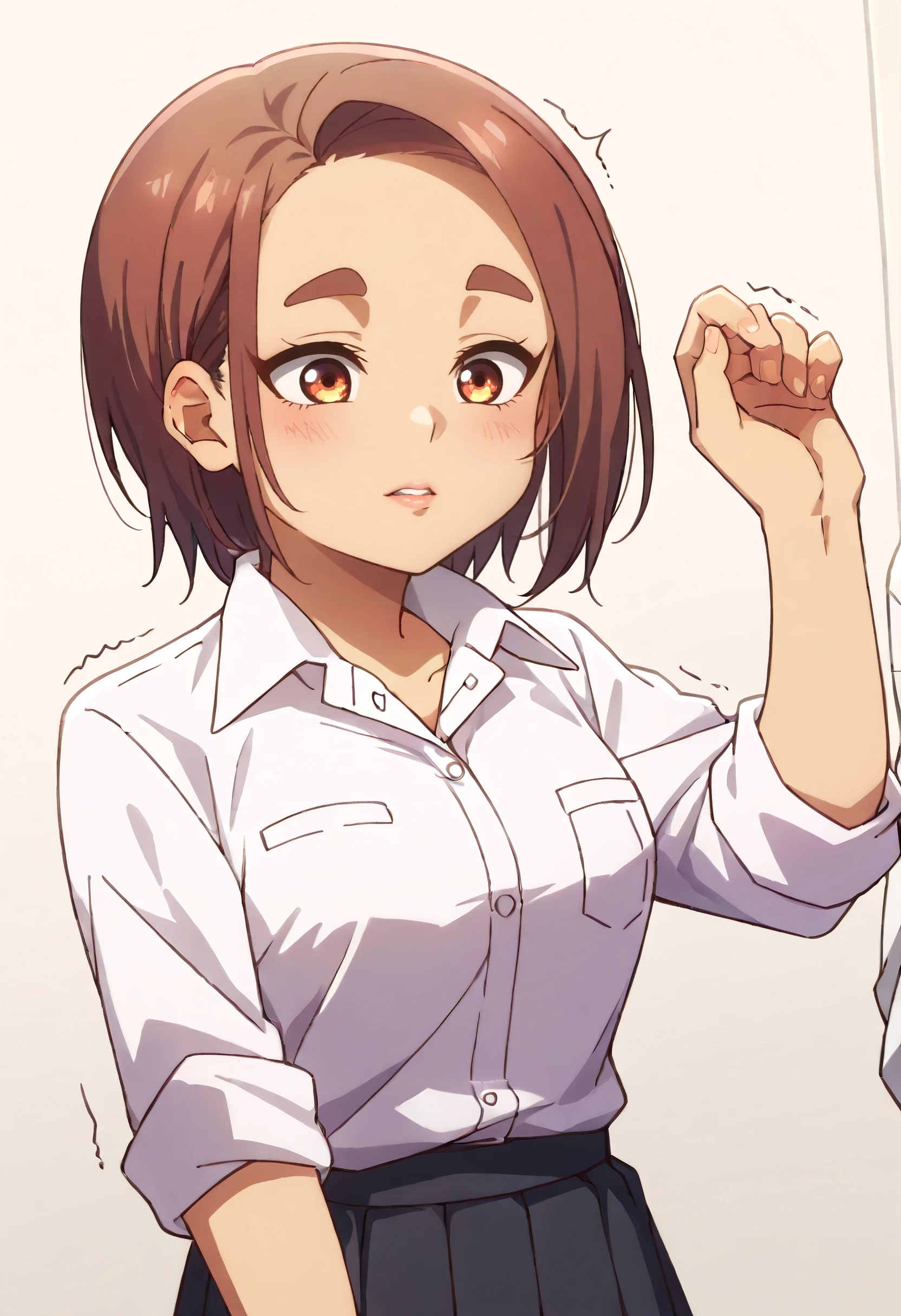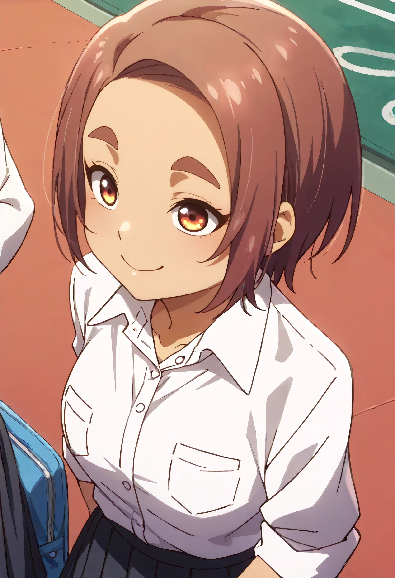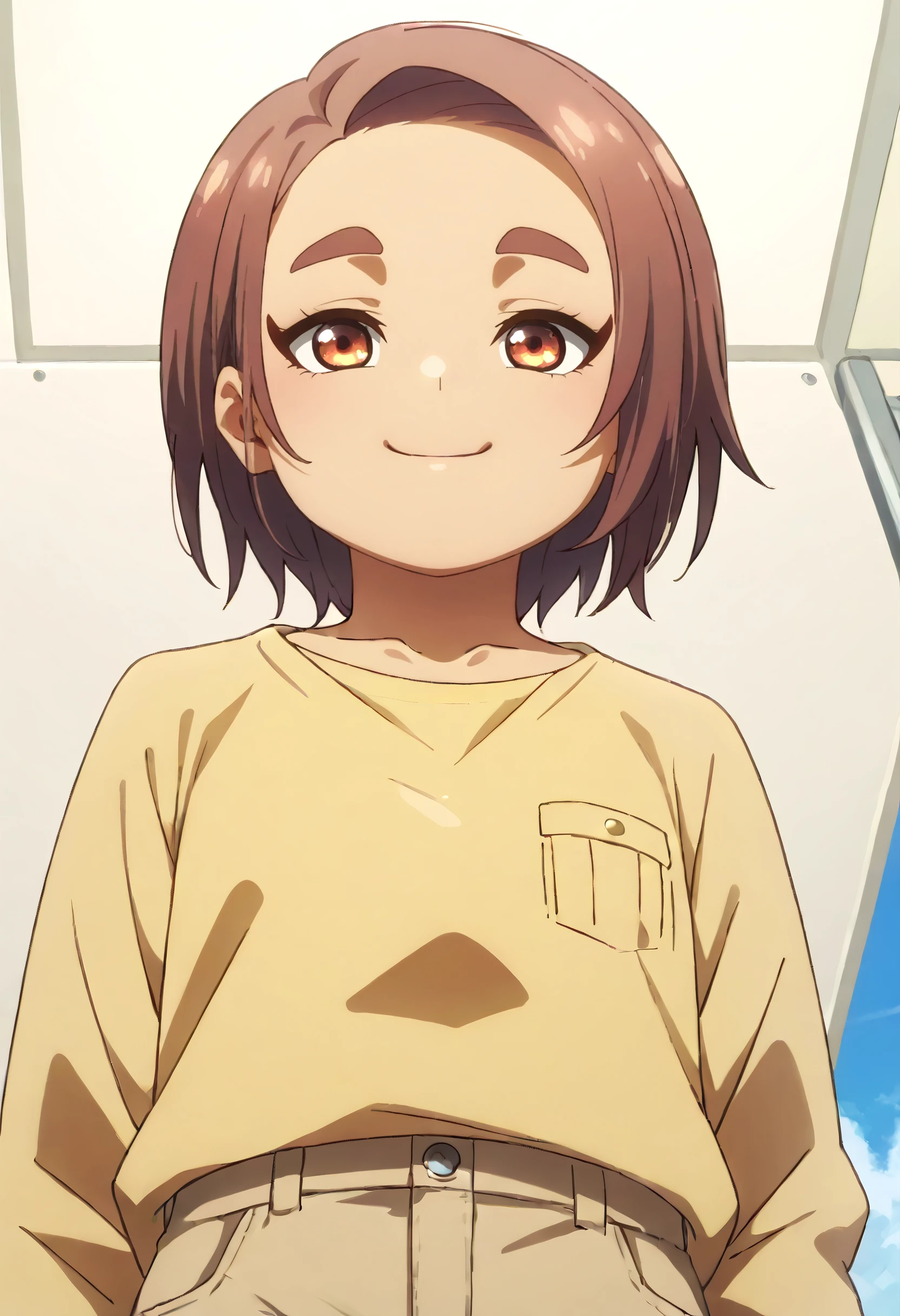 OkiYae, short hair, brown eyes, brown hair, thick eyebrows, forehead, short eyebrows,