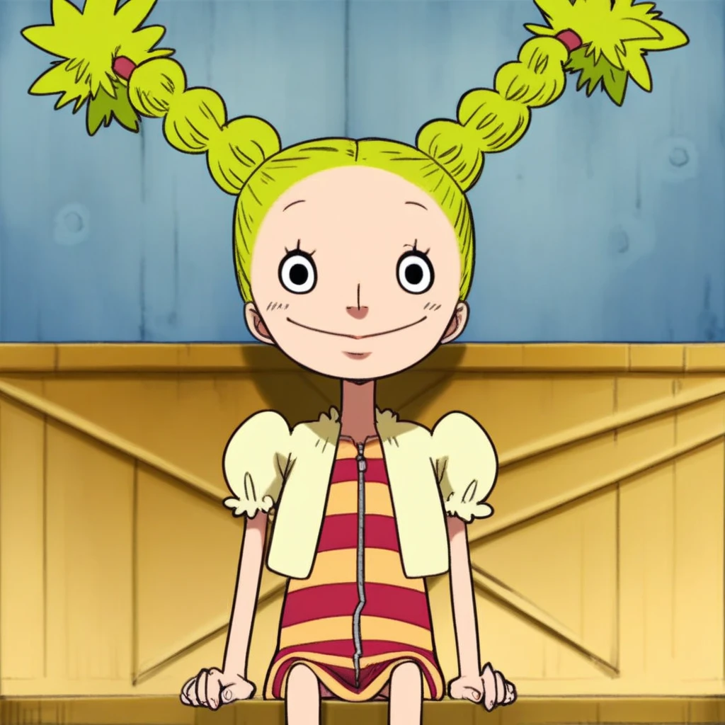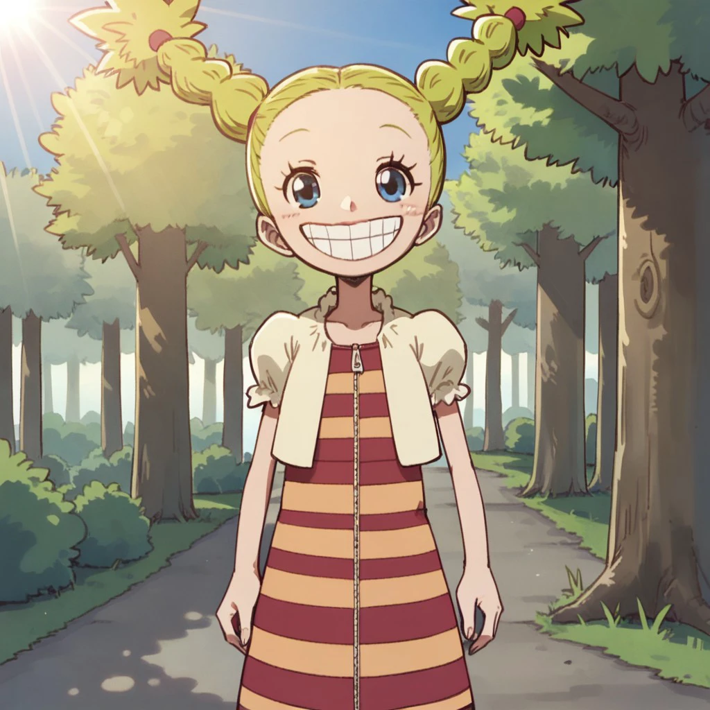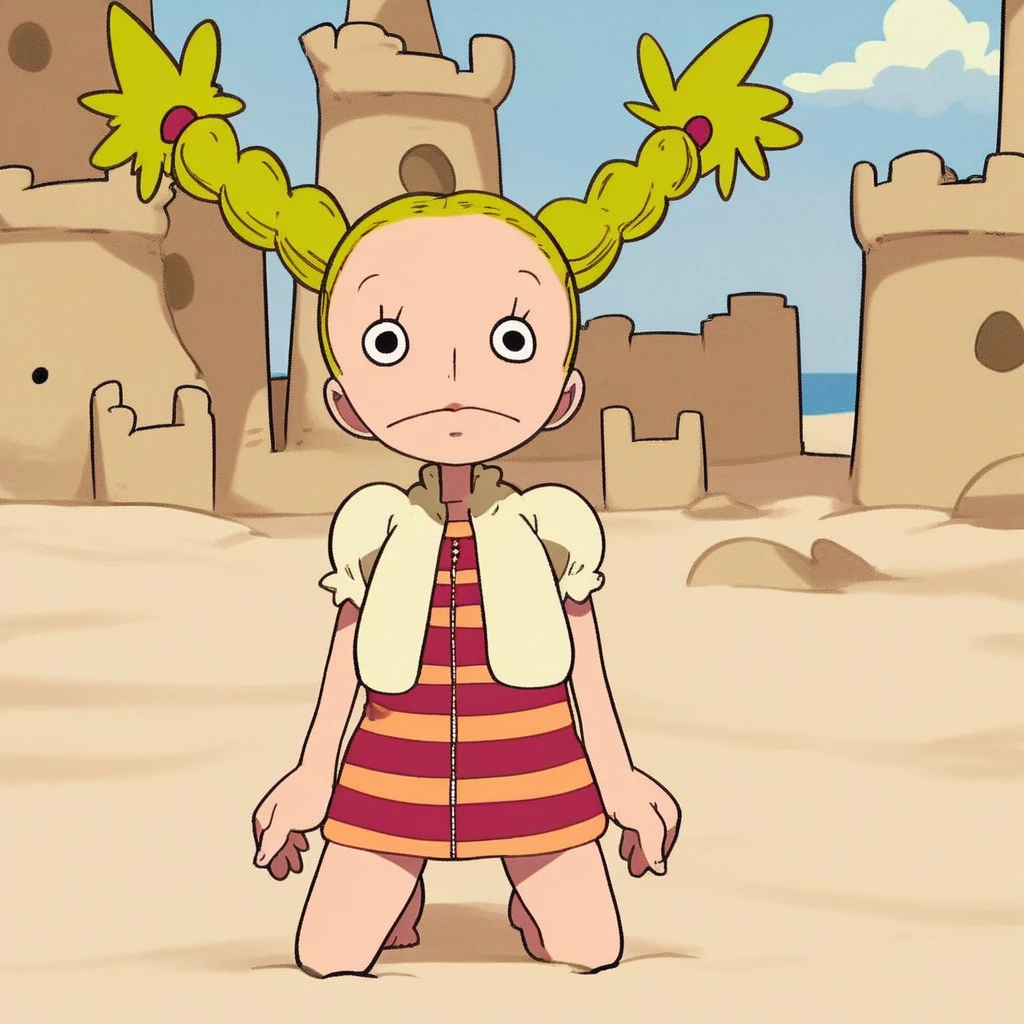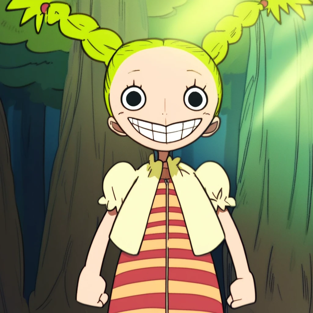 chim_op, 1girl, blonde hair, twin braids, striped, dress, puffy sleeves