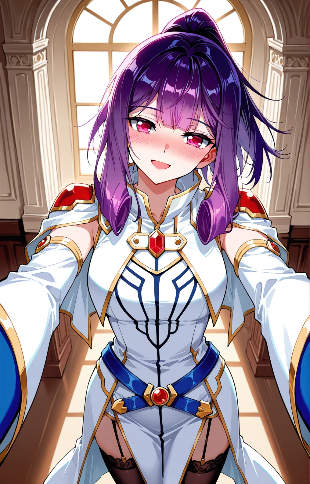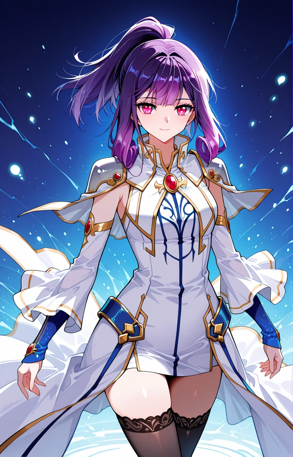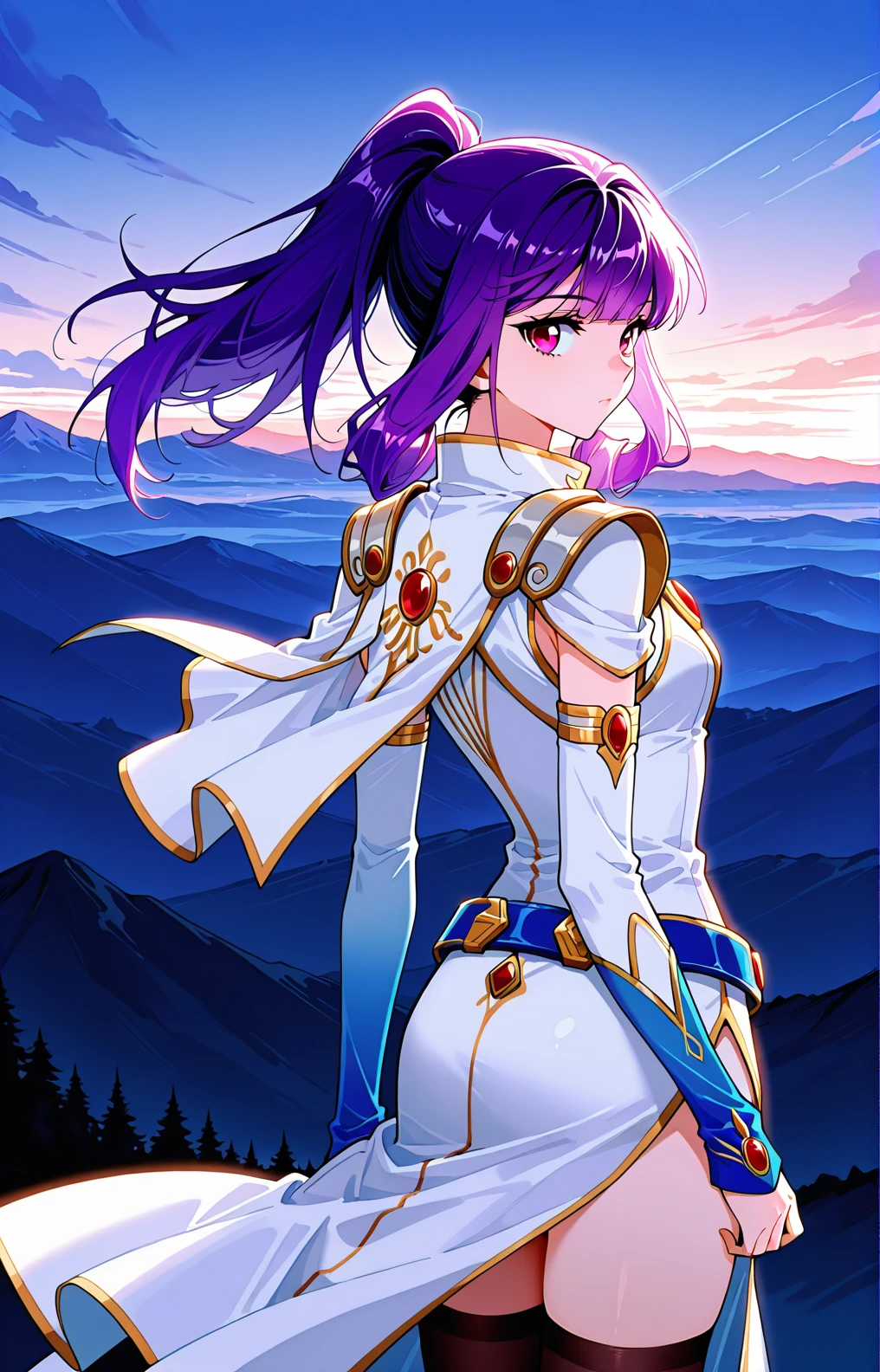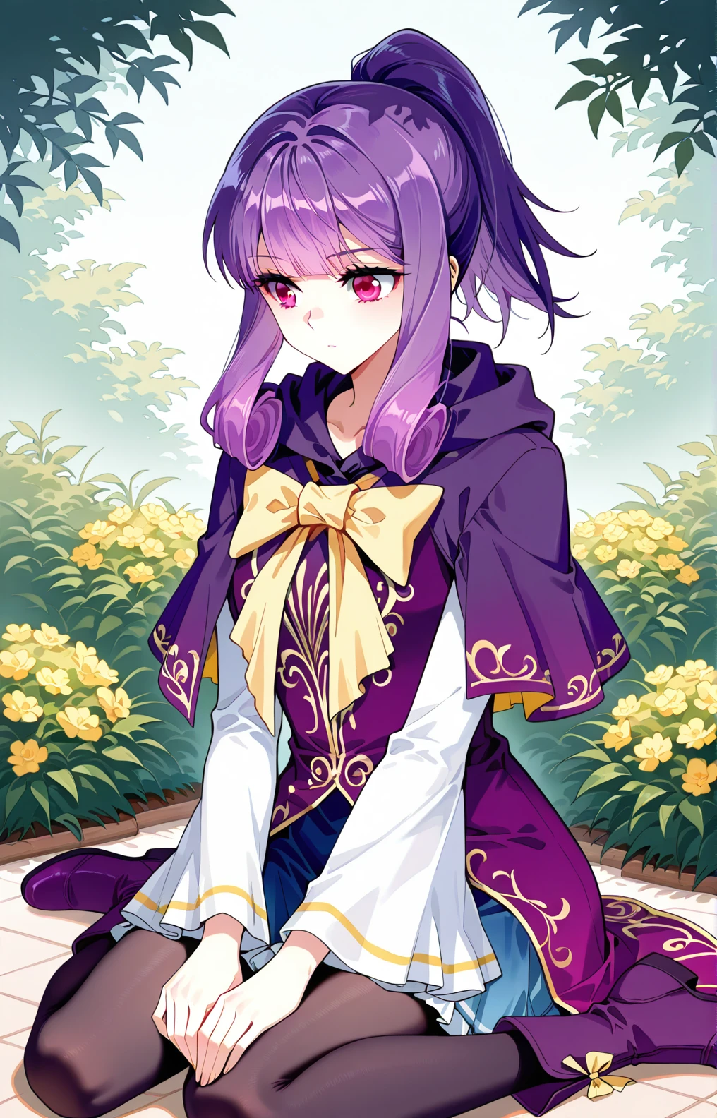 Jiujiu, magenta eyes, long hair, purple hair, high ponytail, long sidelocks, long bangs,