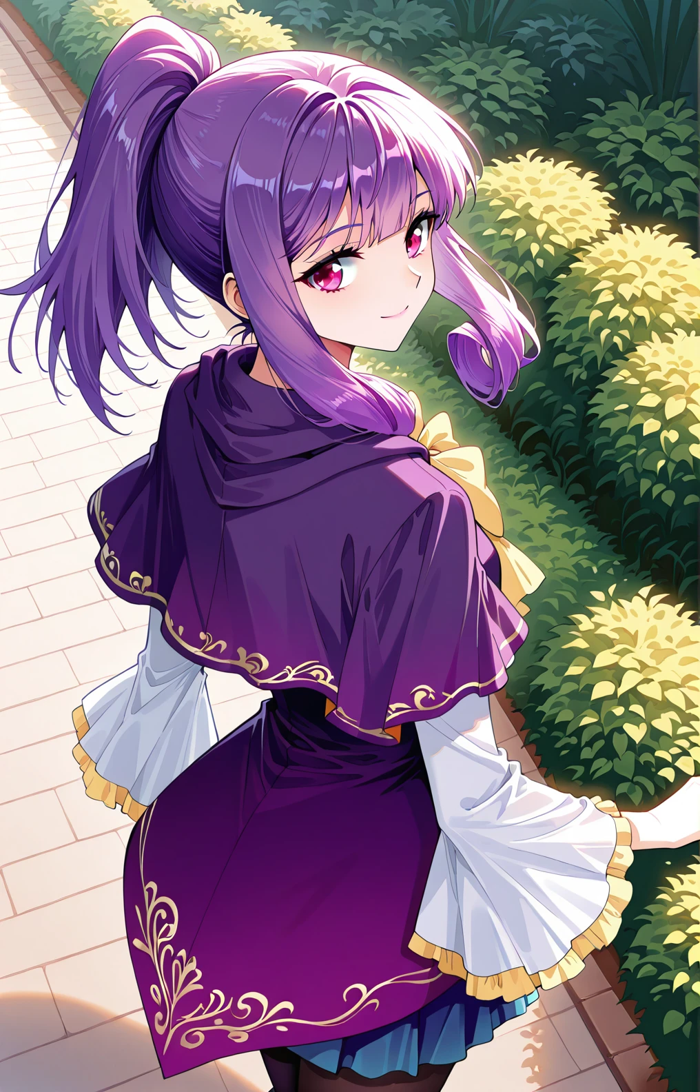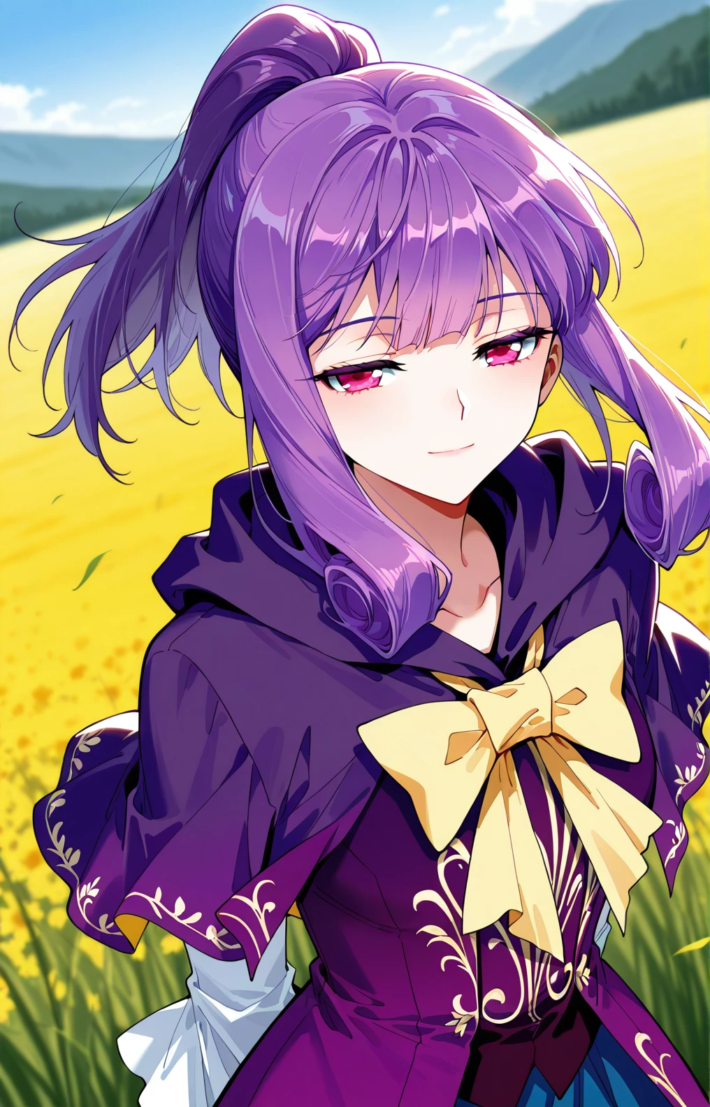 Jiujiu_outfit1, purple capelet with yellow lining, large yellow bow, purple jacket, puffed short sleeves, golden embroidery, white shirt with wide sleeves, blue inner cuffs, large yellow bow, blue skirt with yellow hem, thigh-high black stockings, white sleeves, purple boots