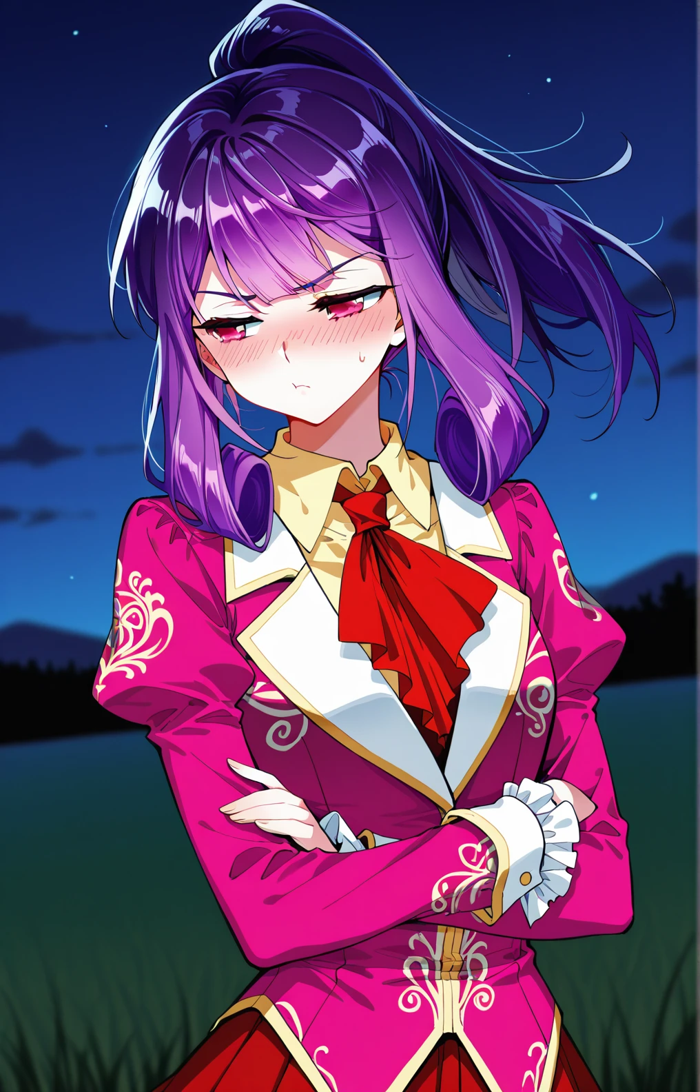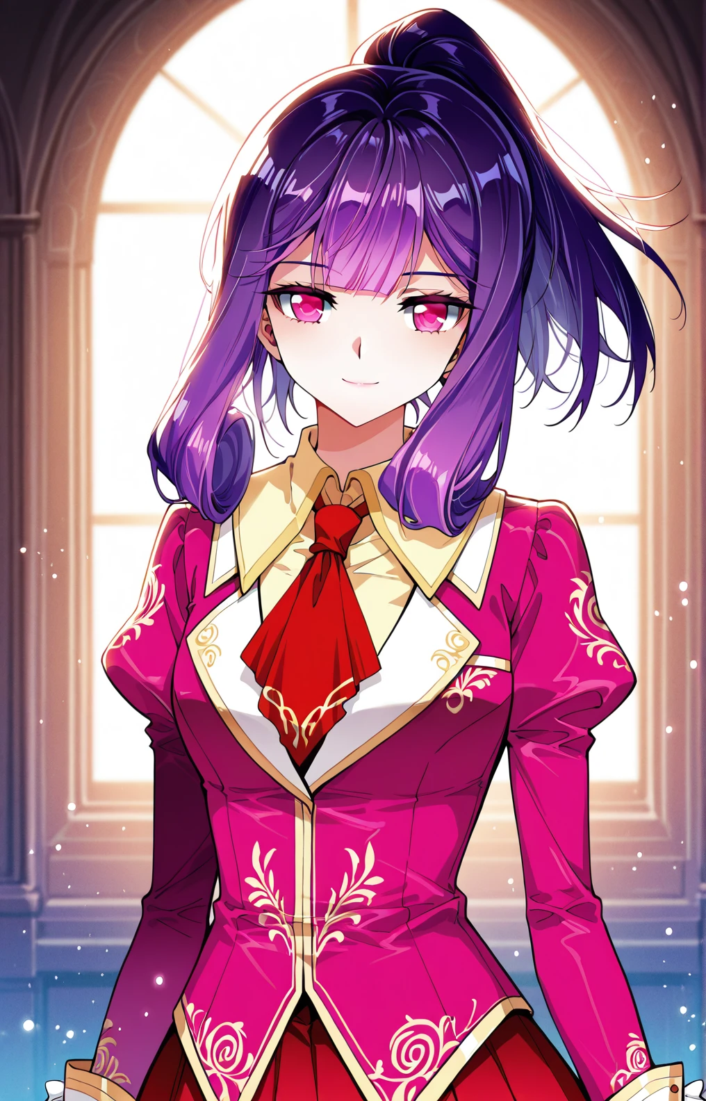 Jiujiu_outfit3, magenta blazer, gold trim, ornate swirl pattern, fitted jacket, yellow inner shirt, pointed collar, red ribbon tie, white frilled cuffs, red pleated skirt,
