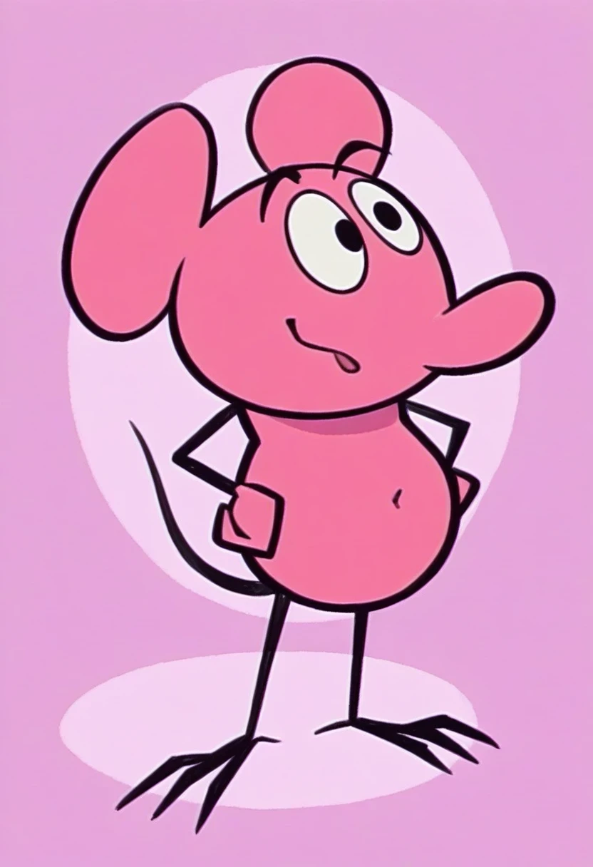 IgnatzMouseKK, 1boy, pink Magenta body, large round ears, long prominent nose, Black eyes, black stick arms, black stick hands, black stick legs, black stick feet, black stick tail, short, chibi