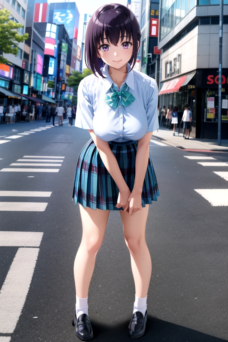 (bow, school uniform, white shirt, short sleeves, pleated skirt, collared shirt, black footwear, plaid, plaid skirt, white socks, loafers, shirt tucked in, green bowtie)