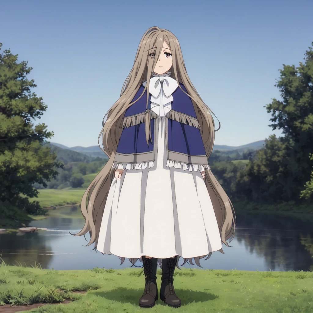 capelet,frills, long dress,white dress,white bow,white bowtie,ribbon, long sleeves, long skirt, boots,black footwear,