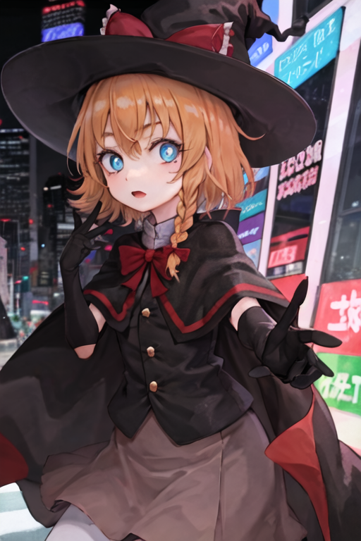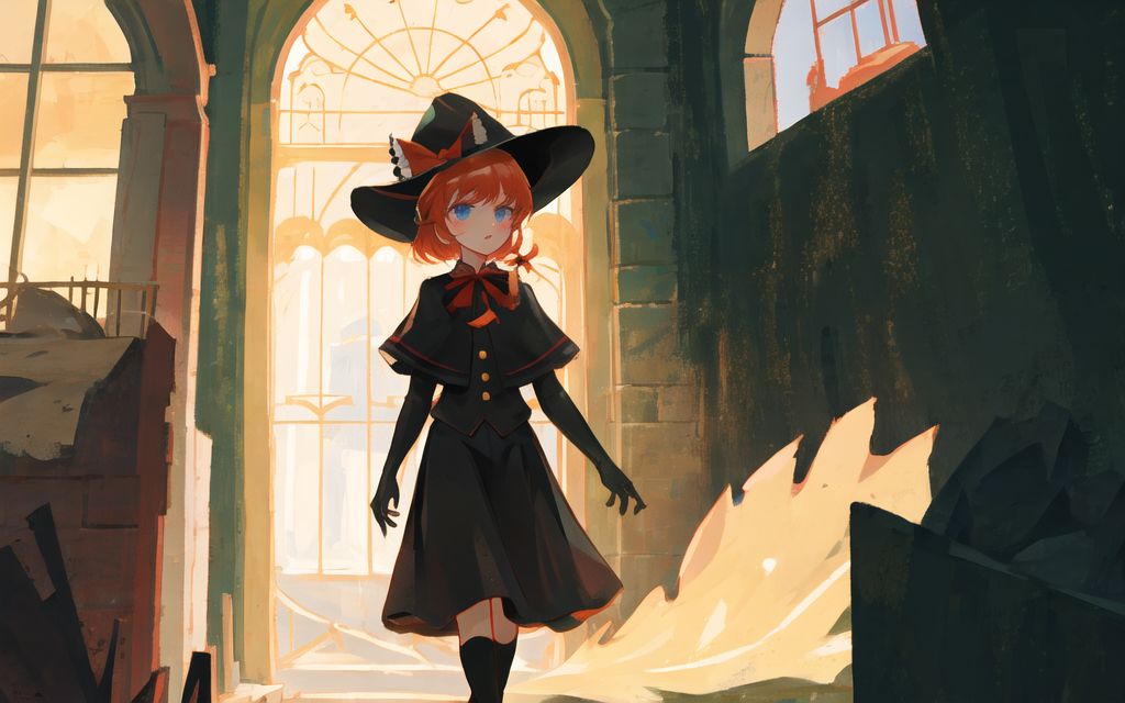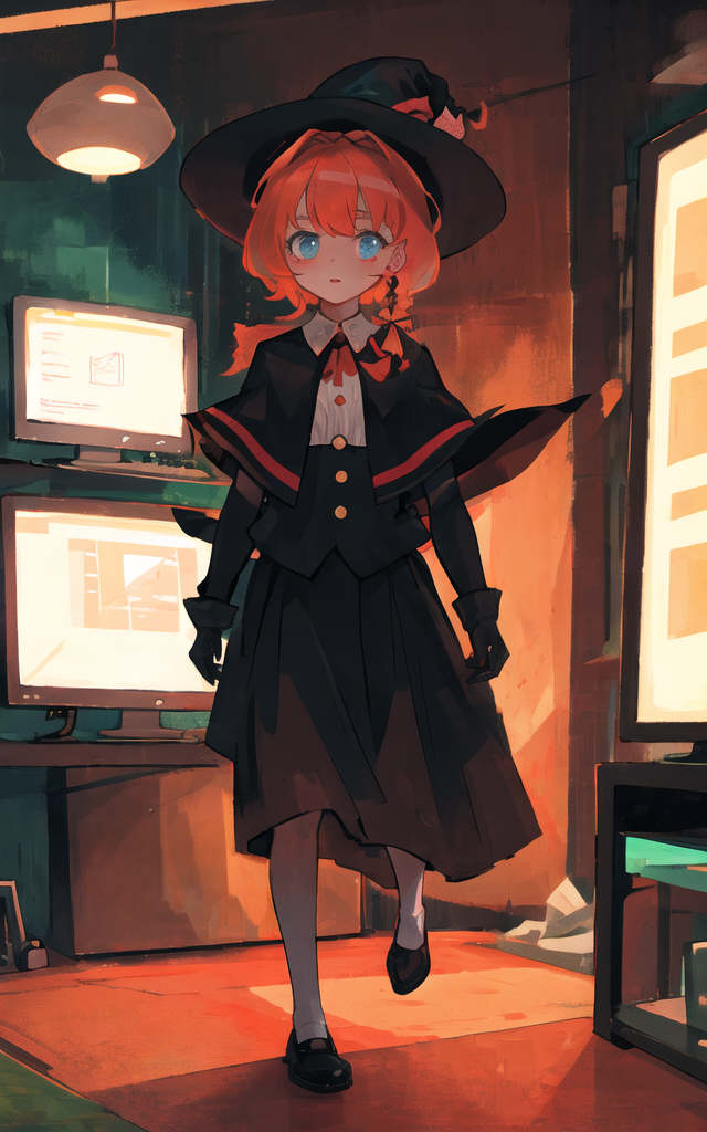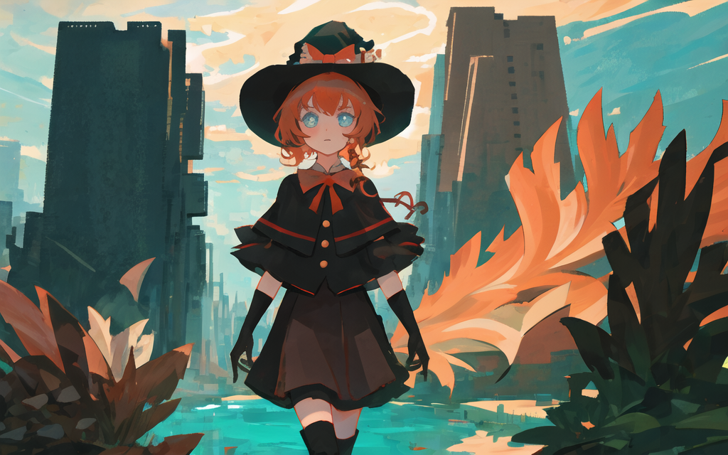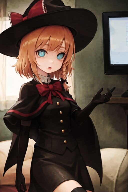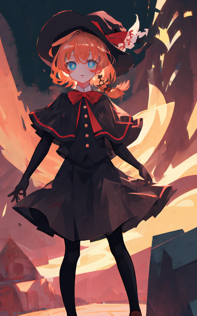 MGR,witch hat,black gloves,red ribbon,white pupil,blue eyes,orange hair,cape,black vest,gold buttons,black skirtDescription