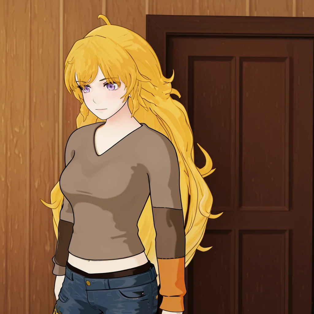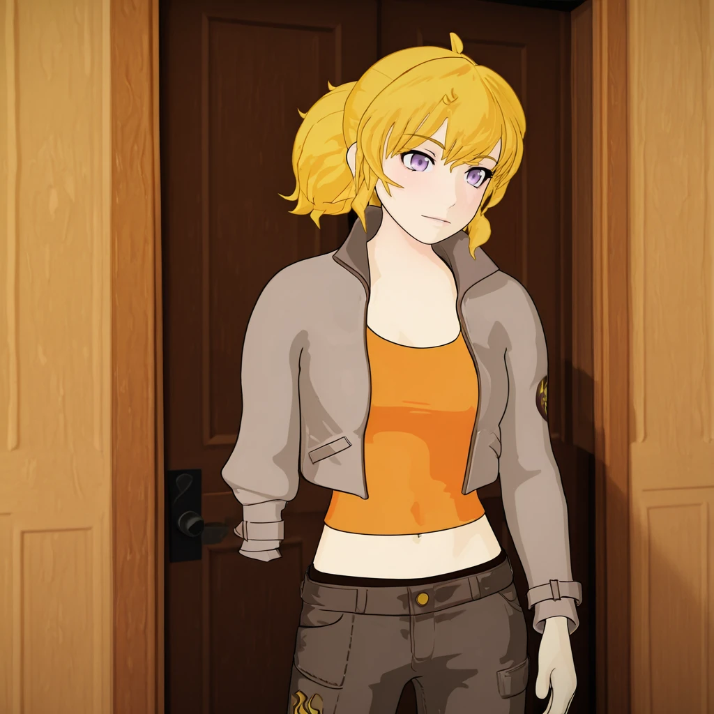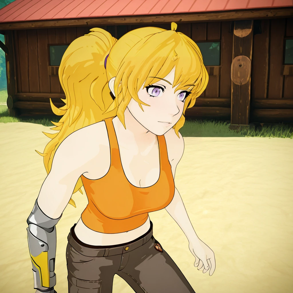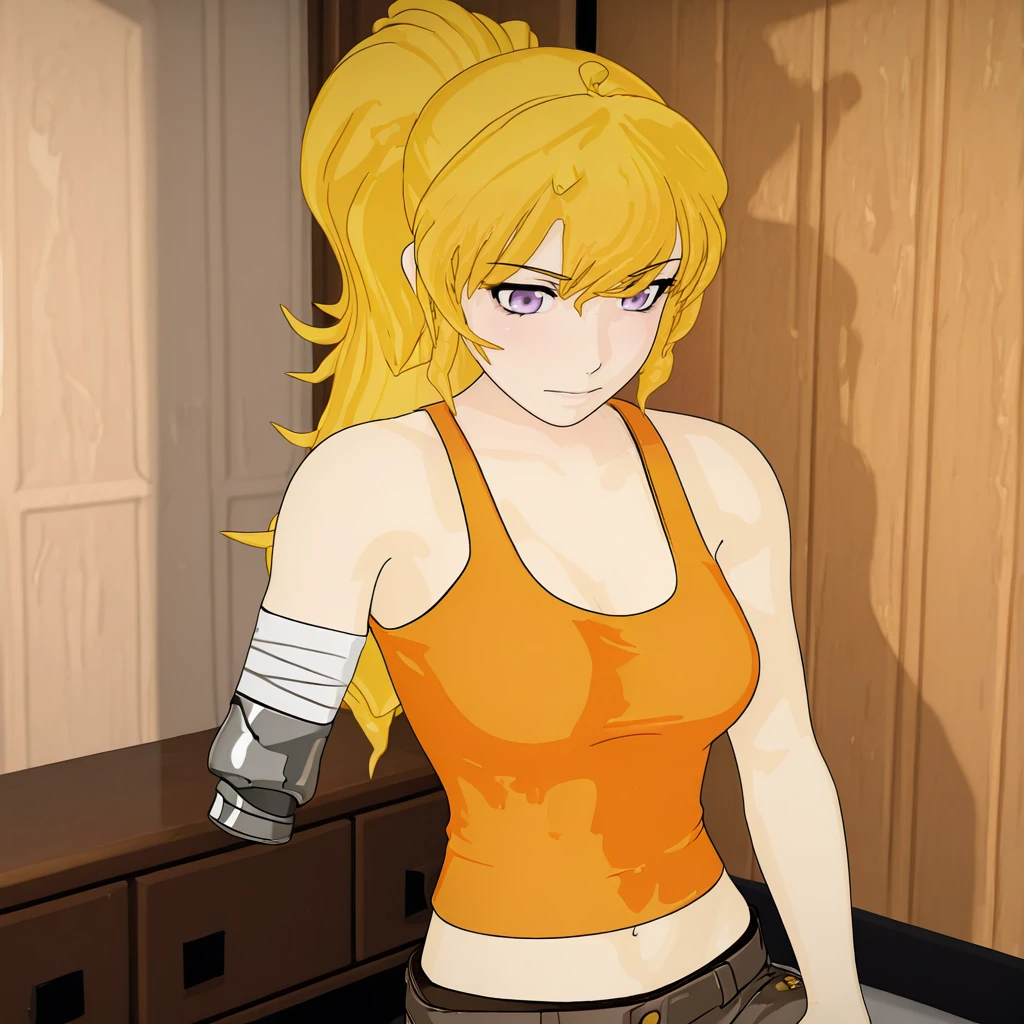Trigger with season 4 tanktop with 2 arms: YangRWBYSeason42Arms, yang xiao long, 1girl, blonde hair, purple eyes, tank top, long hair, navel, midriff, ponytail, pants, cowboy shot