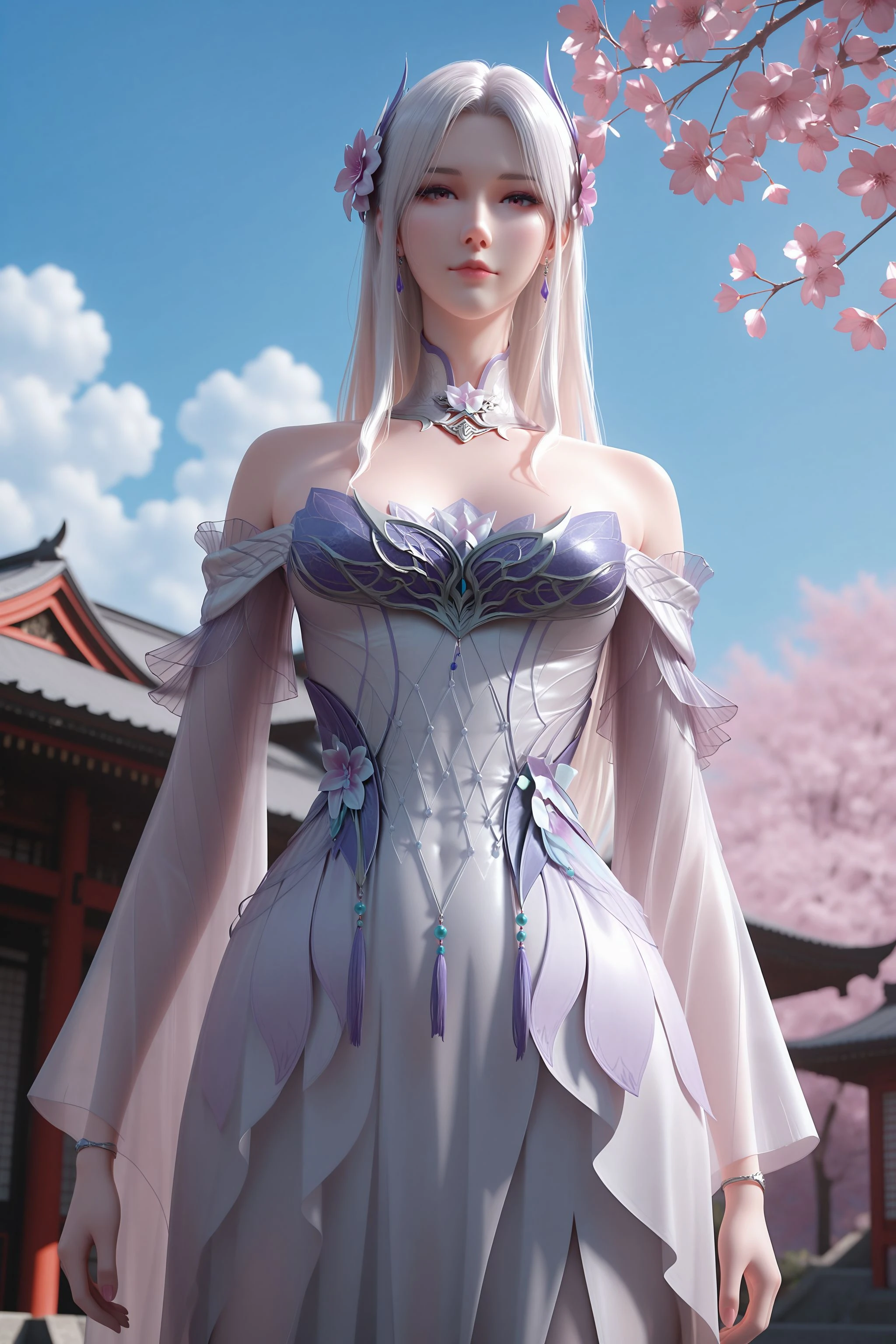 1girl, hair ornament, dress, solo, long hair, jewelry, bare shoulders, flower, hair flower, white hair, earrings