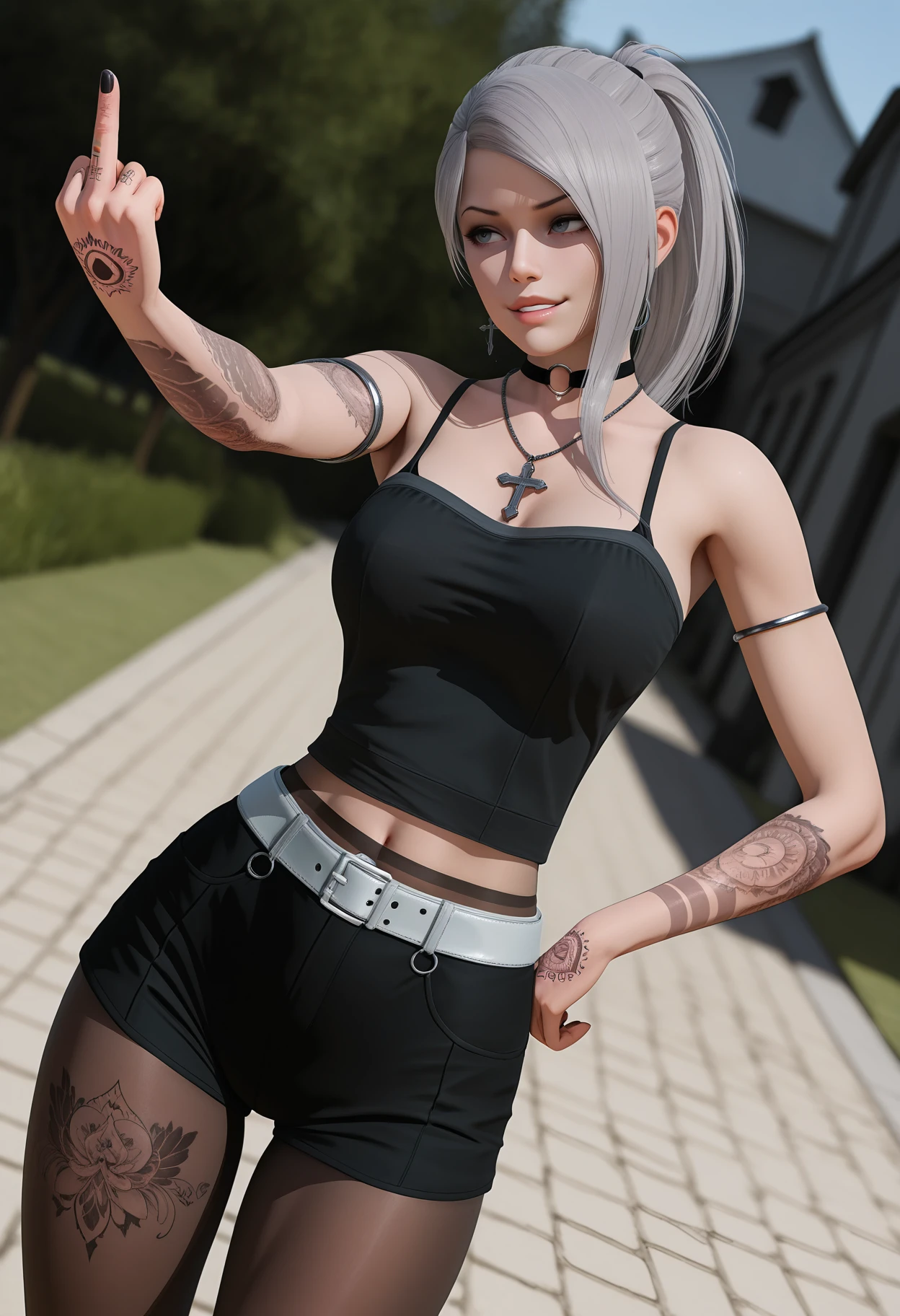 asymmetrical hair, ponytail, o-ring choker, cross necklace, black camisole, midriff peek, pantyhose under shorts, white belt, black shorts, armlet, arm tattoo, hand tattoo, leg tattoo,