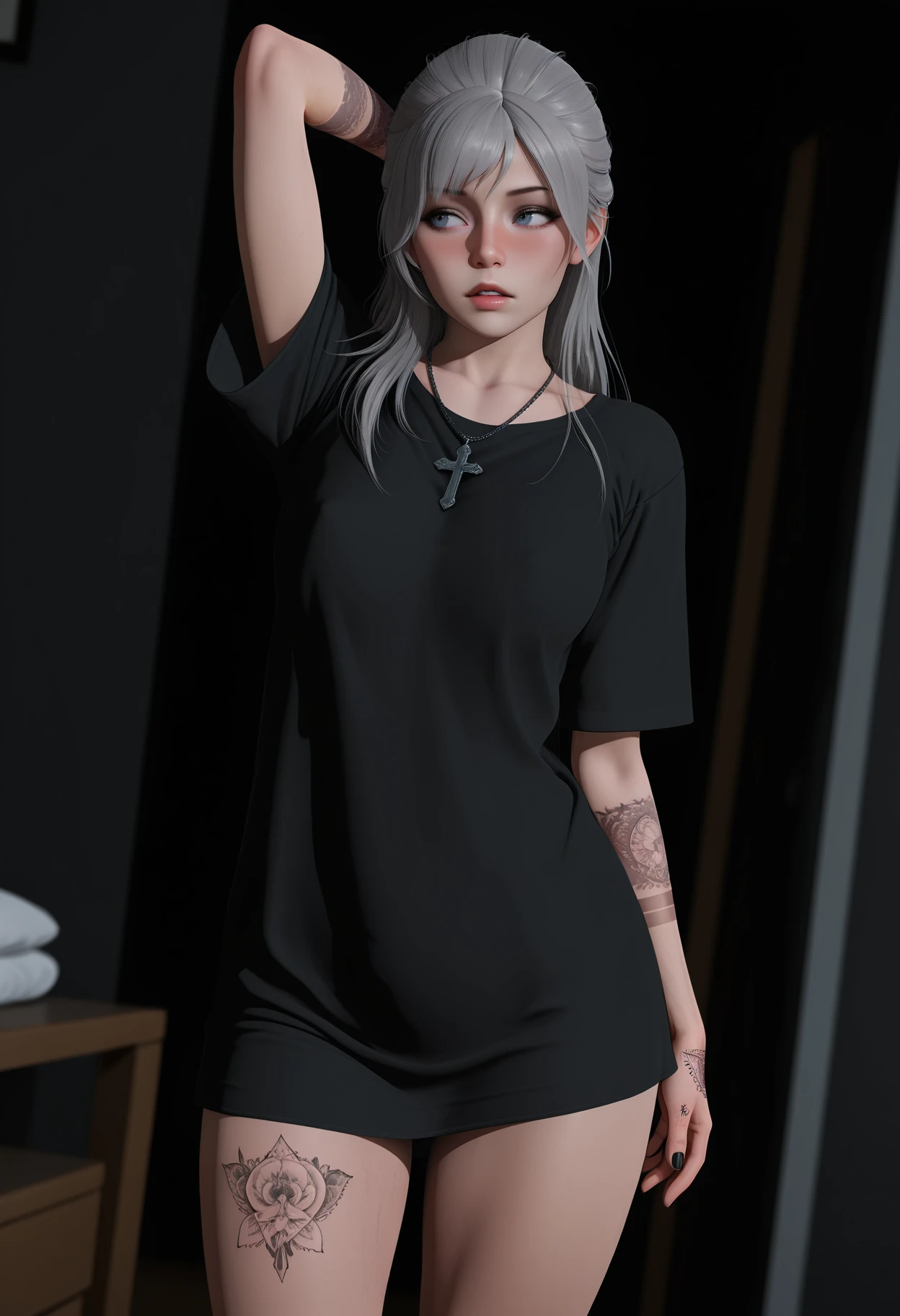 asymmetrical hair, half updo, cross necklace, long shirt, black shirt, no pants, arm tattoo, hand tattoo, leg tattoo,