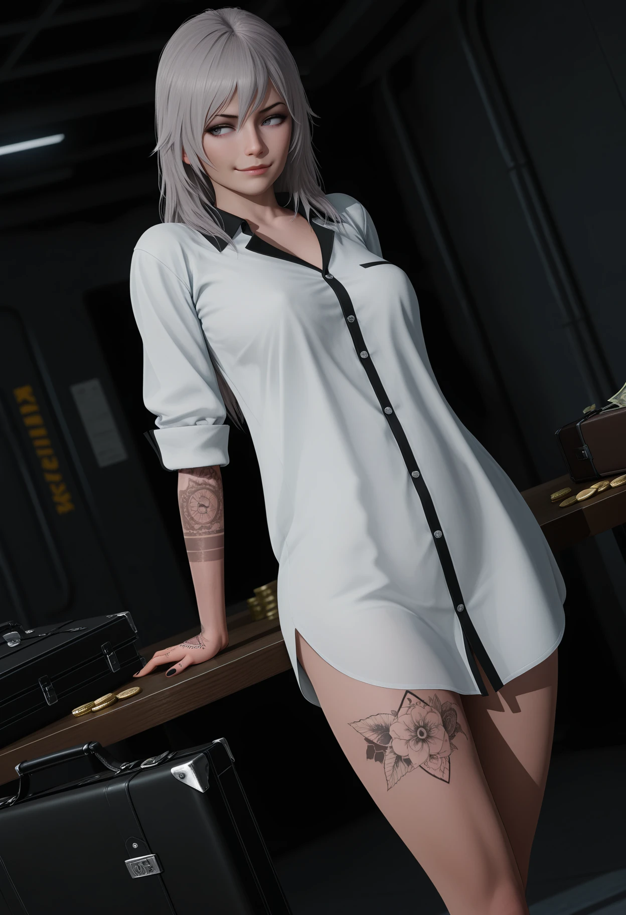 hair down, ????? shirt, collared shirt, long shirt, white shirt, black trim, sleeves rolled up, arm tattoo, hand tattoo, leg tattoo,