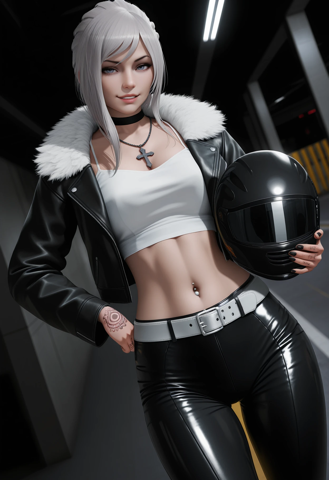 asymmetrical hair, braided ponytail, black choker, cross necklace, leather jacket, open jacket, fur trim, white camisole, crop top, navel piercing, white belt, leather pants, hand tattoo,