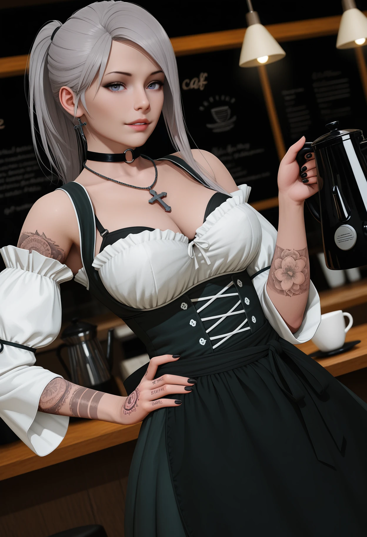 asymmetrical hair, ponytail, o-ring choker, cross necklace, dirndl, black dress, ???? shoulders, bra peek, black bra, detached sleeves, black apron, arm tattoo, hand tattoo,