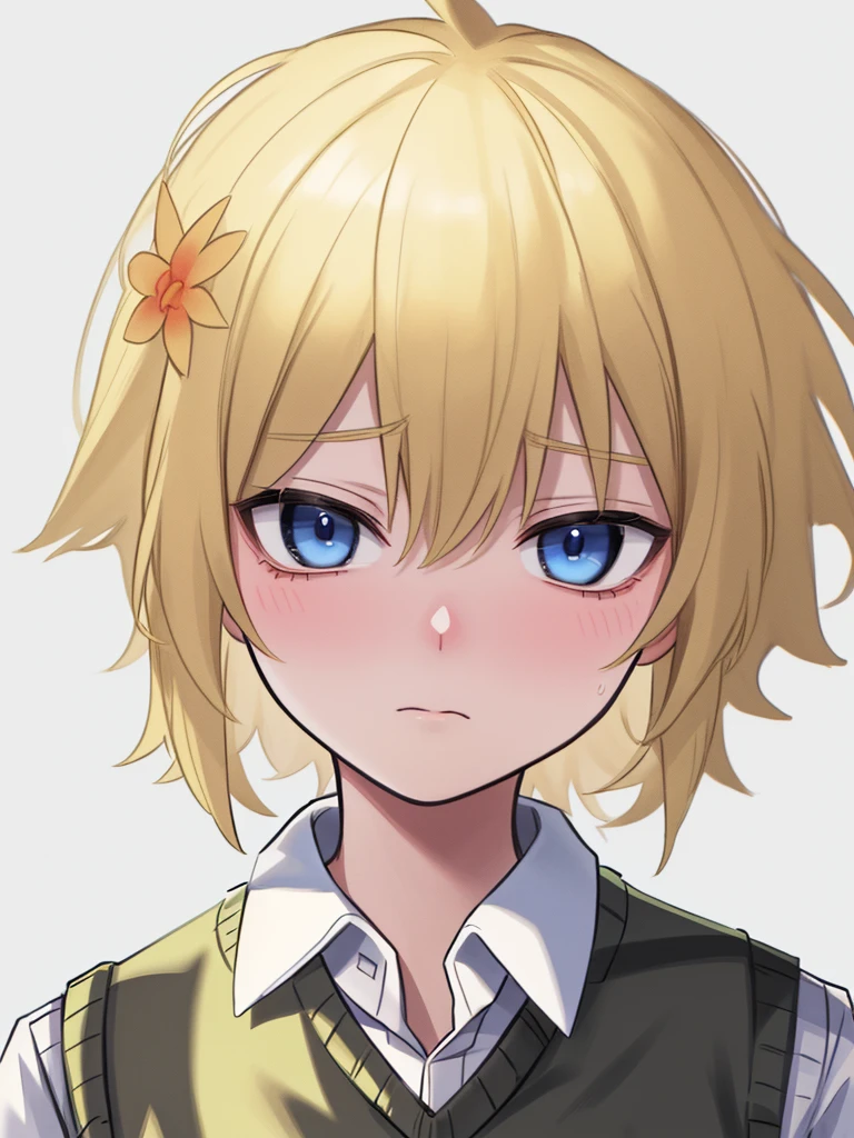 Default: basil, 1boy, blonde hair, blue eyes, white shirt, sweater vest, hair flower, shorts, knee socks, shoes