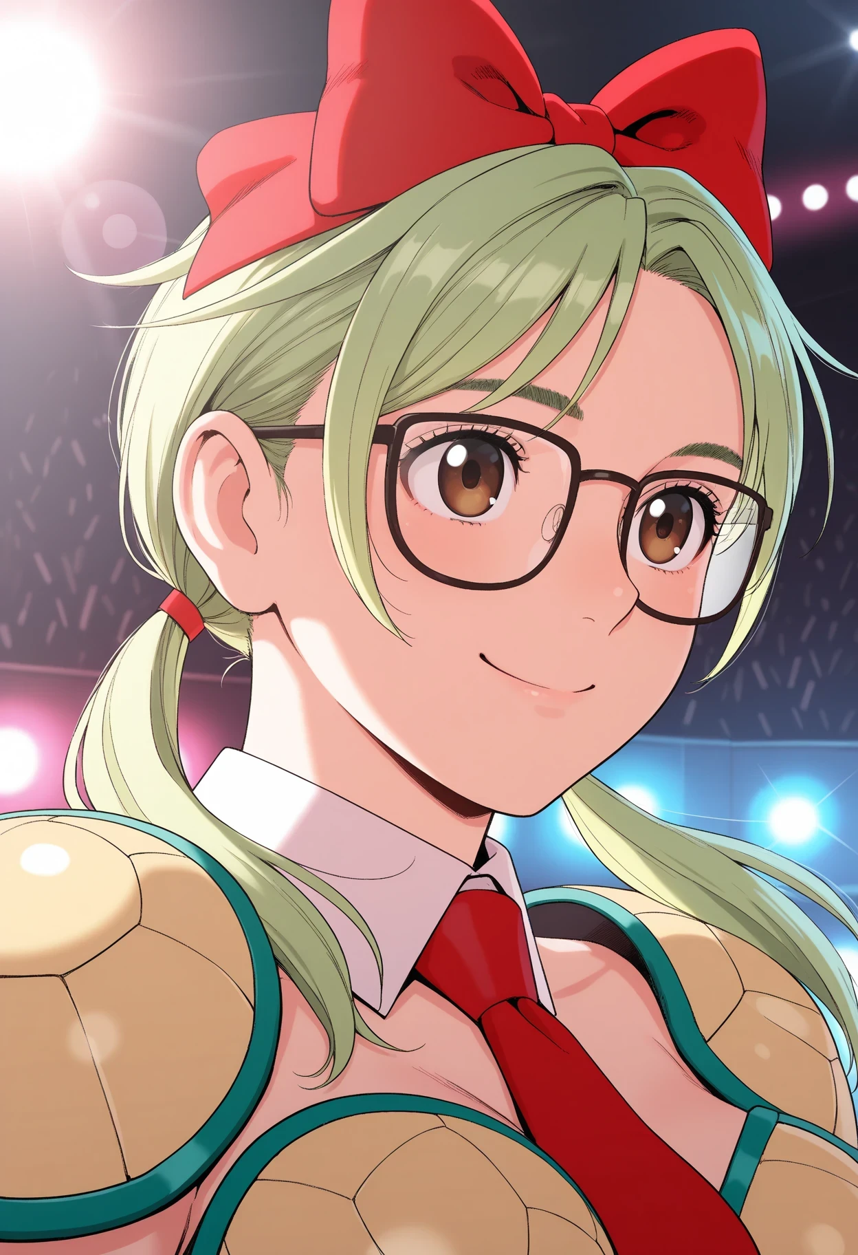 long hair, pink gloves, thighhighs, bow, navel, ribbon, twintails, hazel eyes, swimsuit, ahoge, hair ribbon, sidelocks, hair bow, , red necktie, boots, teeth, green hair, glasses, elbow gloves, midriff, white gloves, stomach, fingerless gloves, white thighhighs, armor, red bow, parted bangs, groin, floating hair, hair intakes, white , thigh boots, shoulder armor, microphone, black-framed eyewear, pauldrons, armored boots, holding microphone, knee pads, pink skirt, shoulder pads, armor, shell, showgirl skirt, dithering, themed object, skirt