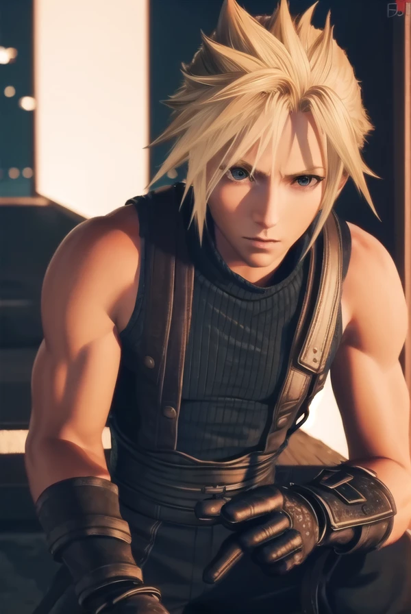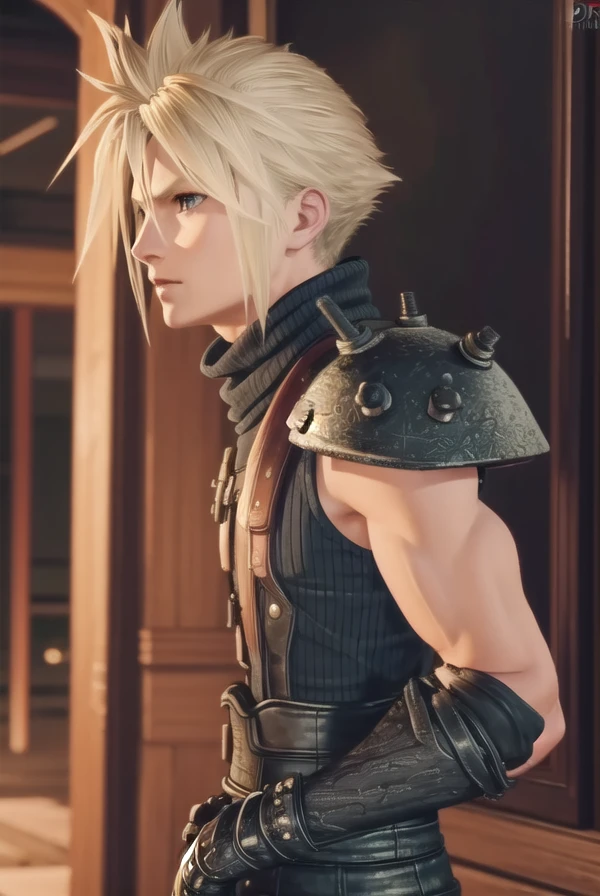 cloud strife, blonde hair, male focus, spiked hair, (grey eyes:1.3),