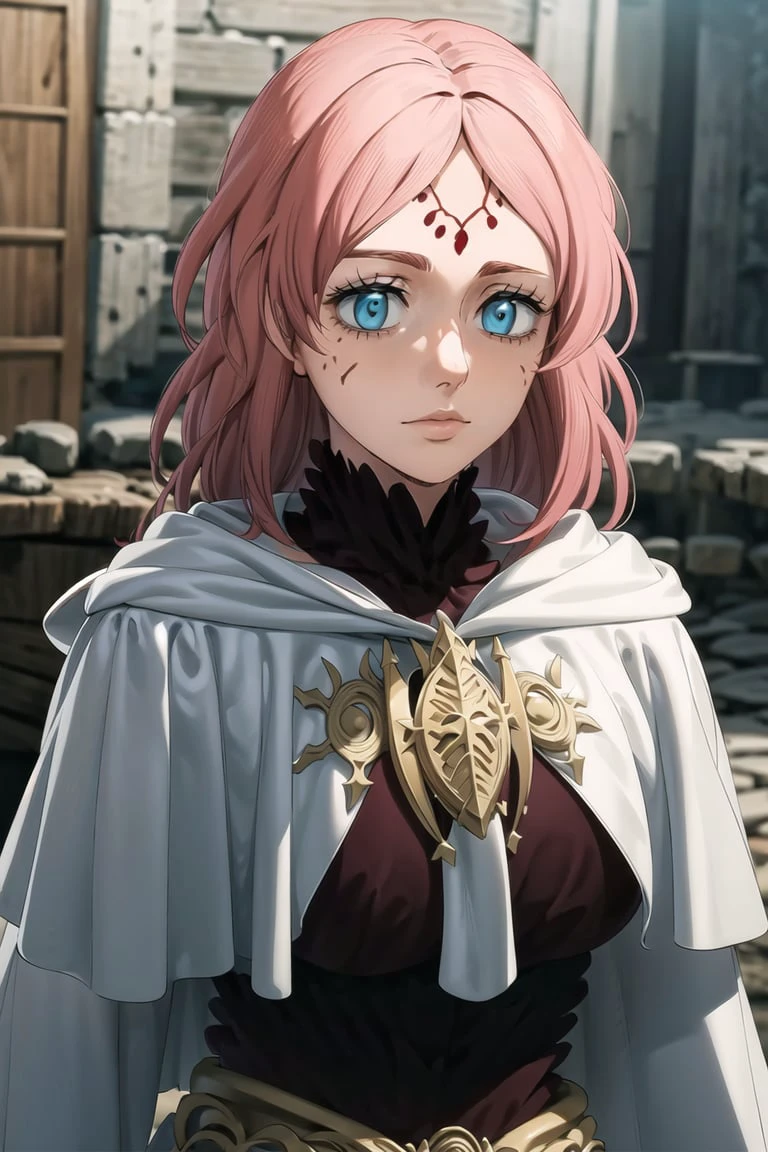 Recommended tags:Fana, 1girl, long hair, blue eyes, pink hair, facial mark, expressionless, forehead mark,toeless footwear,shorts, belt, bag, cape, long sleeves