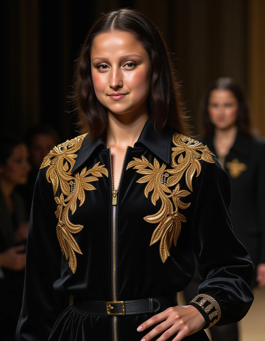 <lora:real_mona_lisa_flux_lora_triggerword_moonal1saa:1.5> extreme closeup of moonal1saa fashion model posing, wearing a black renaissance bomber jacket with gold ornate detailing, high fashion, gucci, on a fashion runway