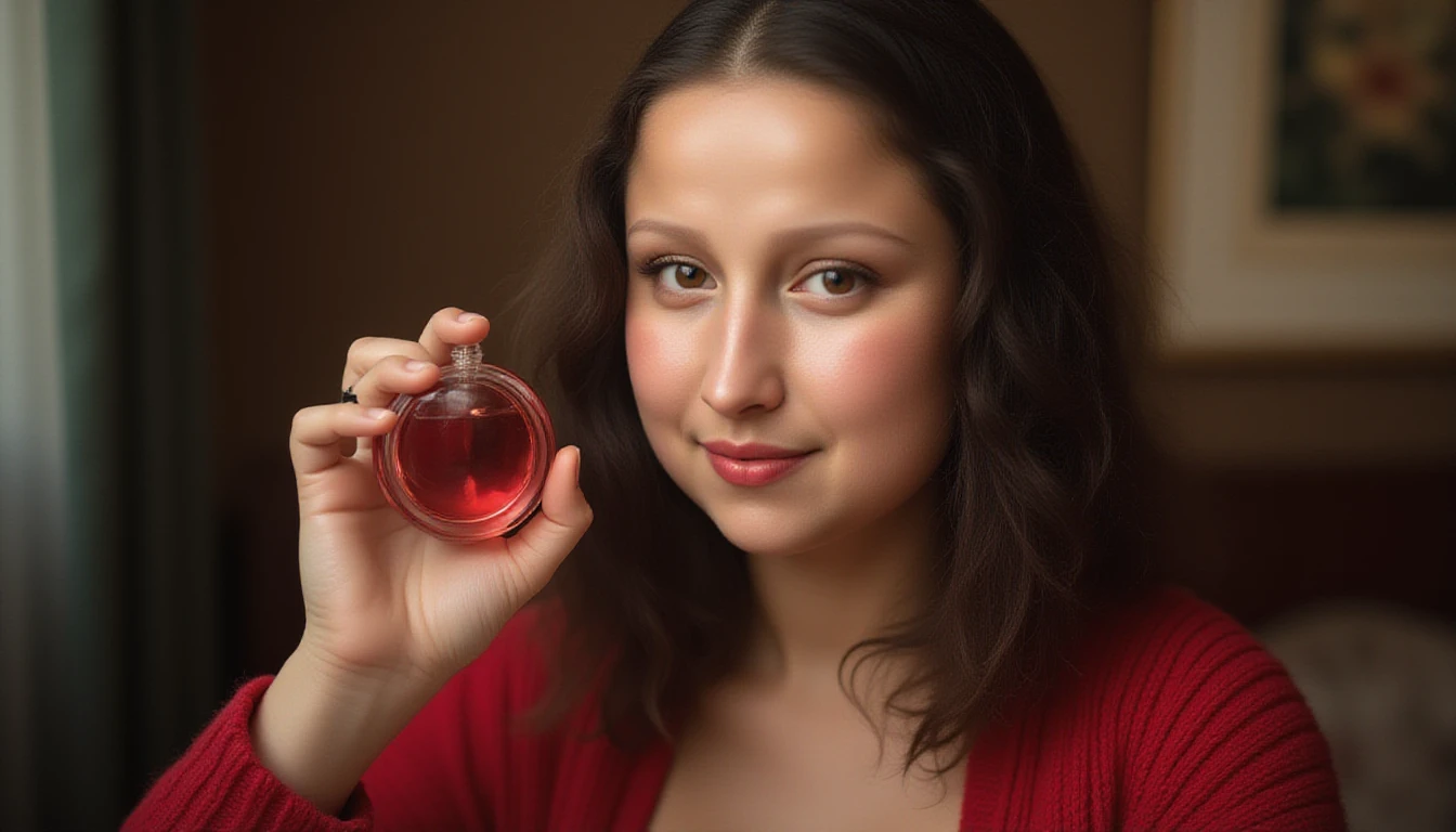 <lora:real_mona_lisa_flux_lora_triggerword_moonal1saa:1.5> a portrait of moonal1saa wearing red lipstick and a red cardigan, holding red lipstick in her right hand