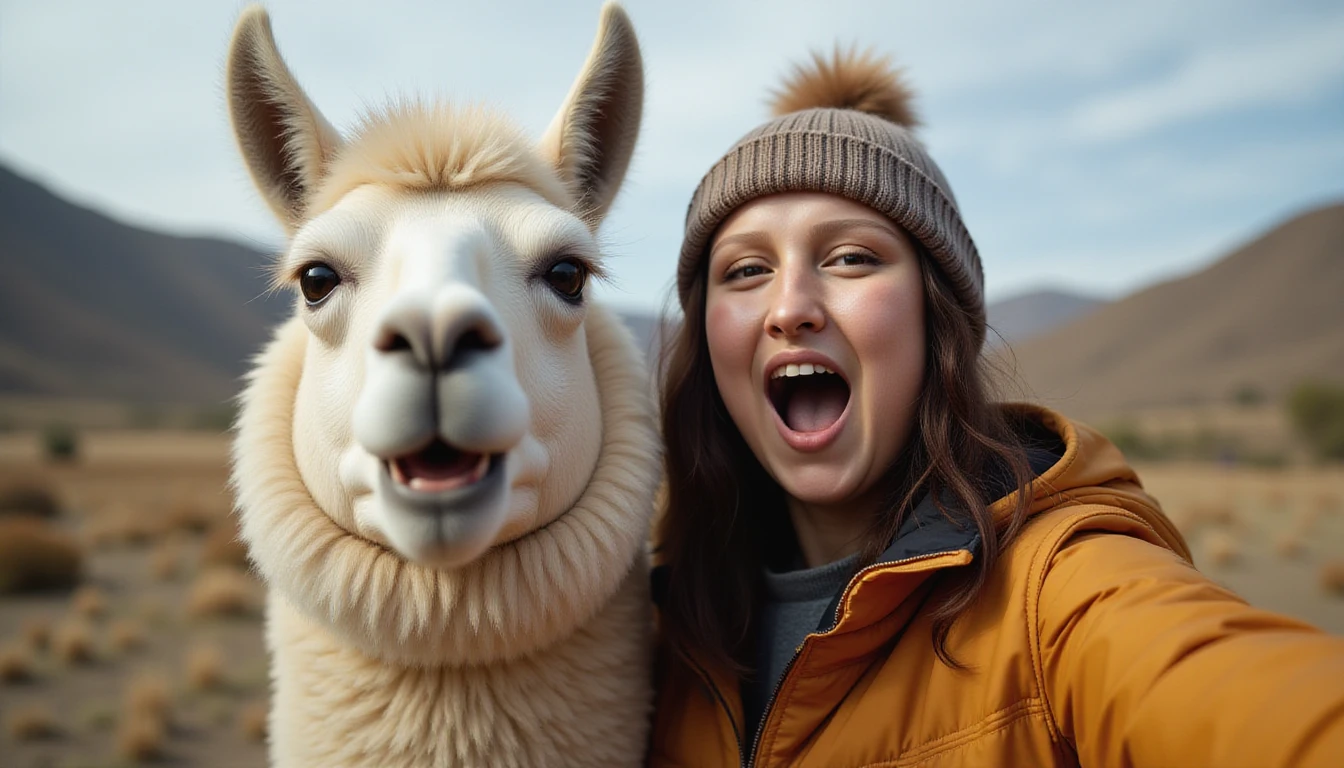 <lora:real_mona_lisa_flux_lora_triggerword_moonal1saa:1.5> a extreme closeup portrait of moonal1saa screaming and taking a selfie with a llama in peru, she is wearing a peruvian cotton jacket and beanie