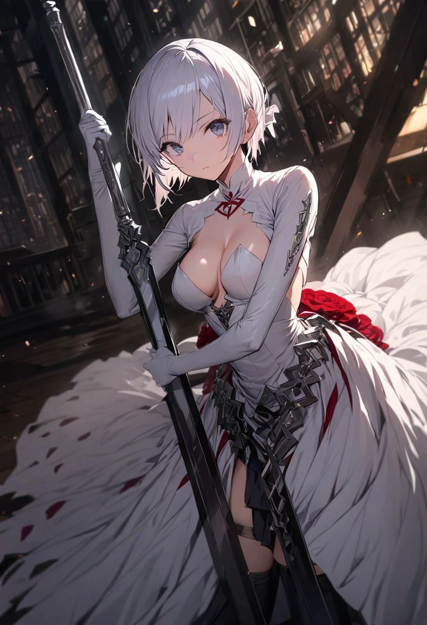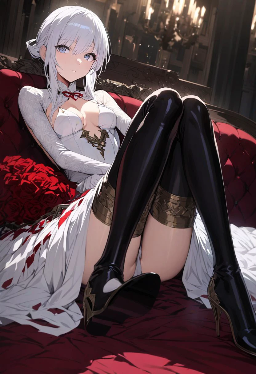 white dress, skirt, thighhighs, cleavage,flower,elbow gloves,white gloves, black boots,