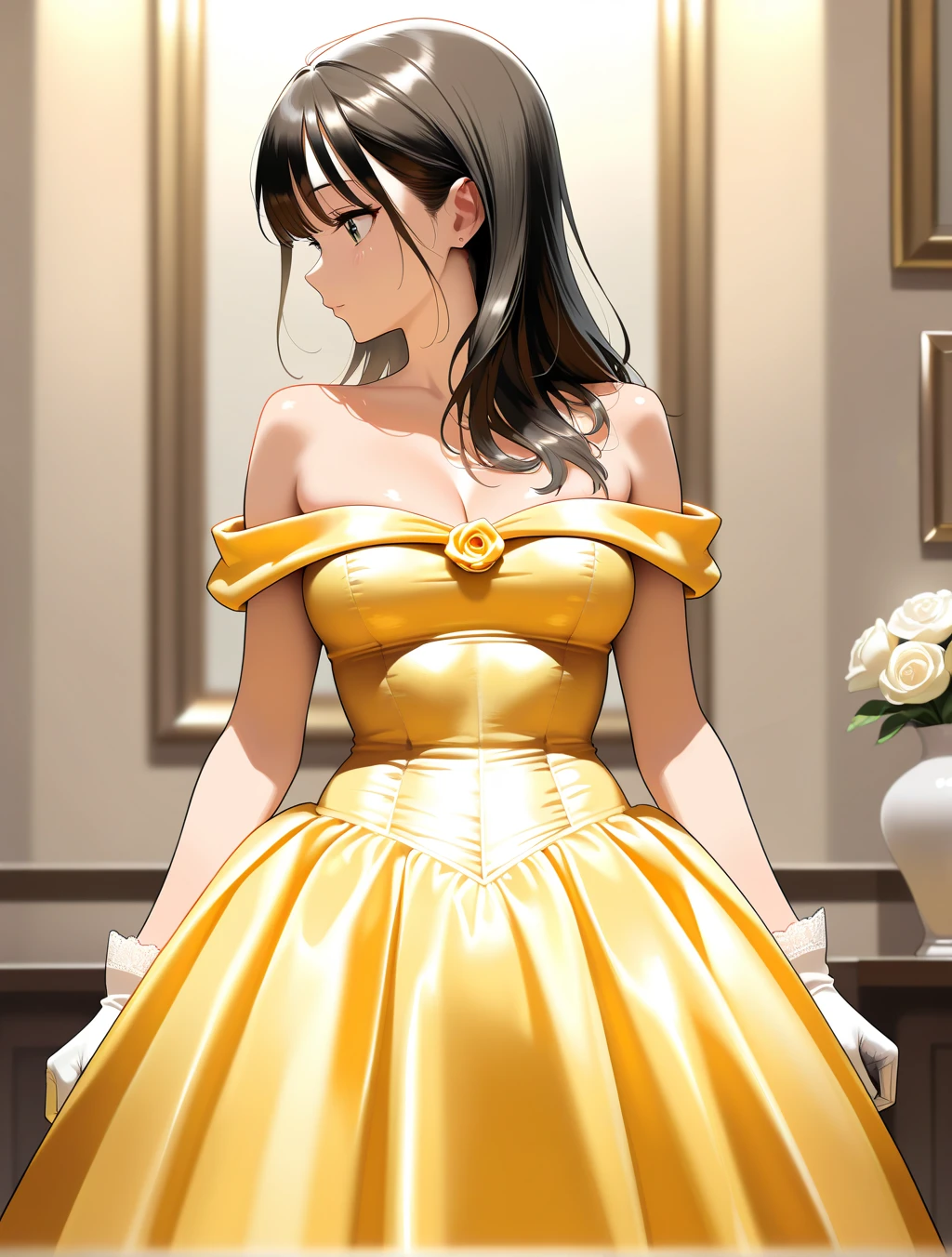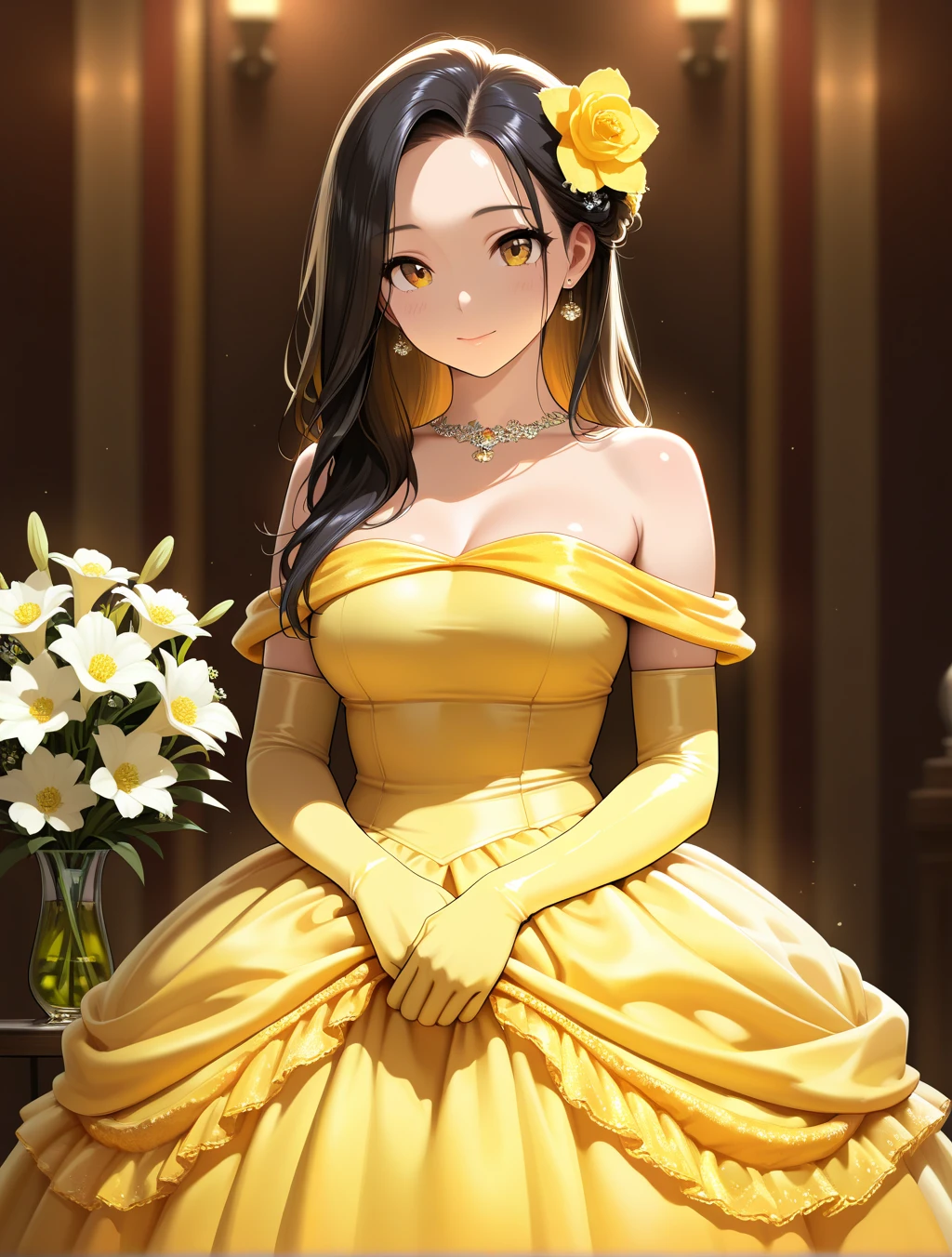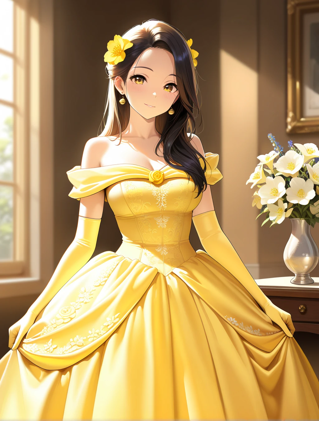 bell's gown,yellow dress,bare shoulders,elbow gloves,yellow gloves,flower,