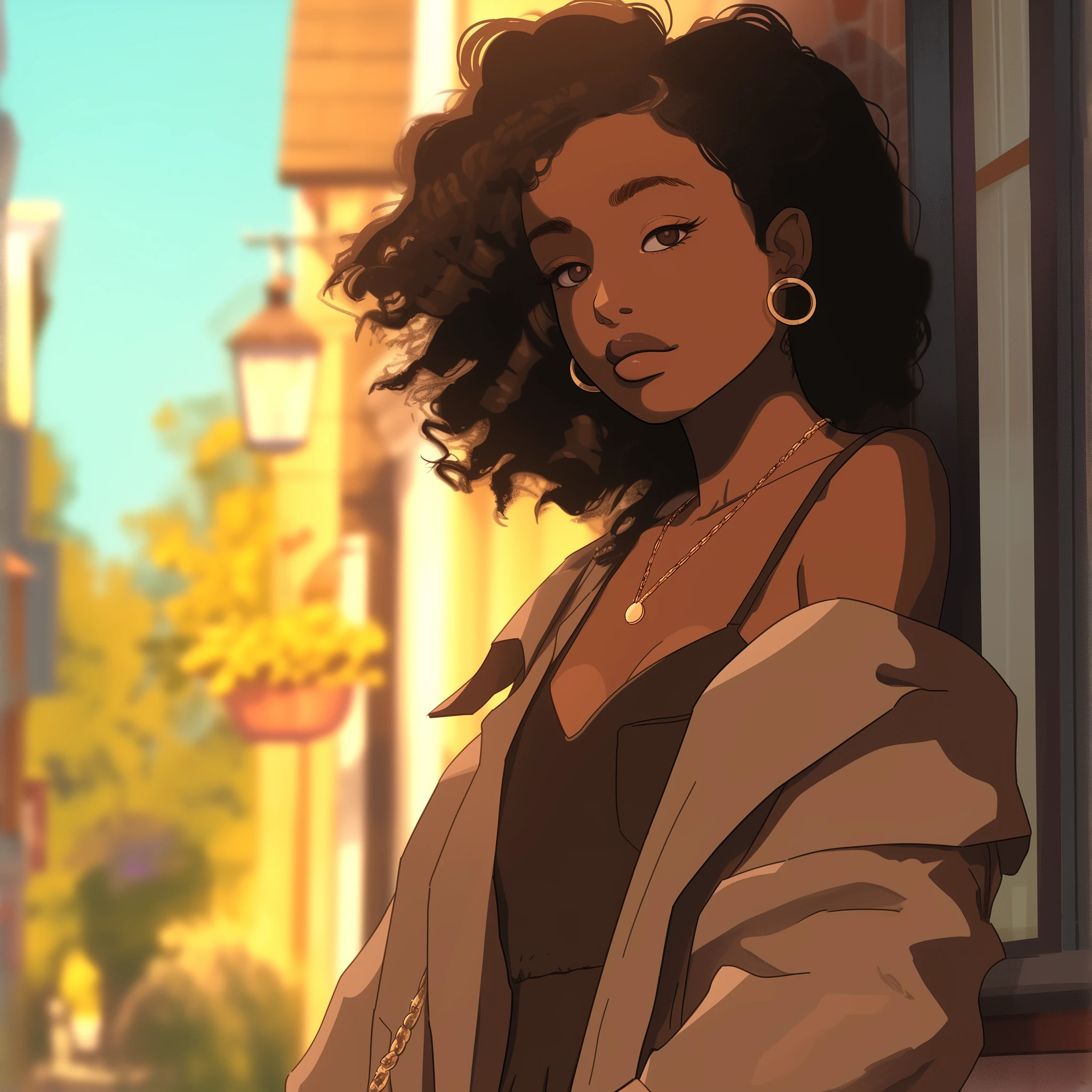A model for an anime character, a sensitive and intelligent college student that is solving a mystery. She has dark skin and medium to long black curly hair.