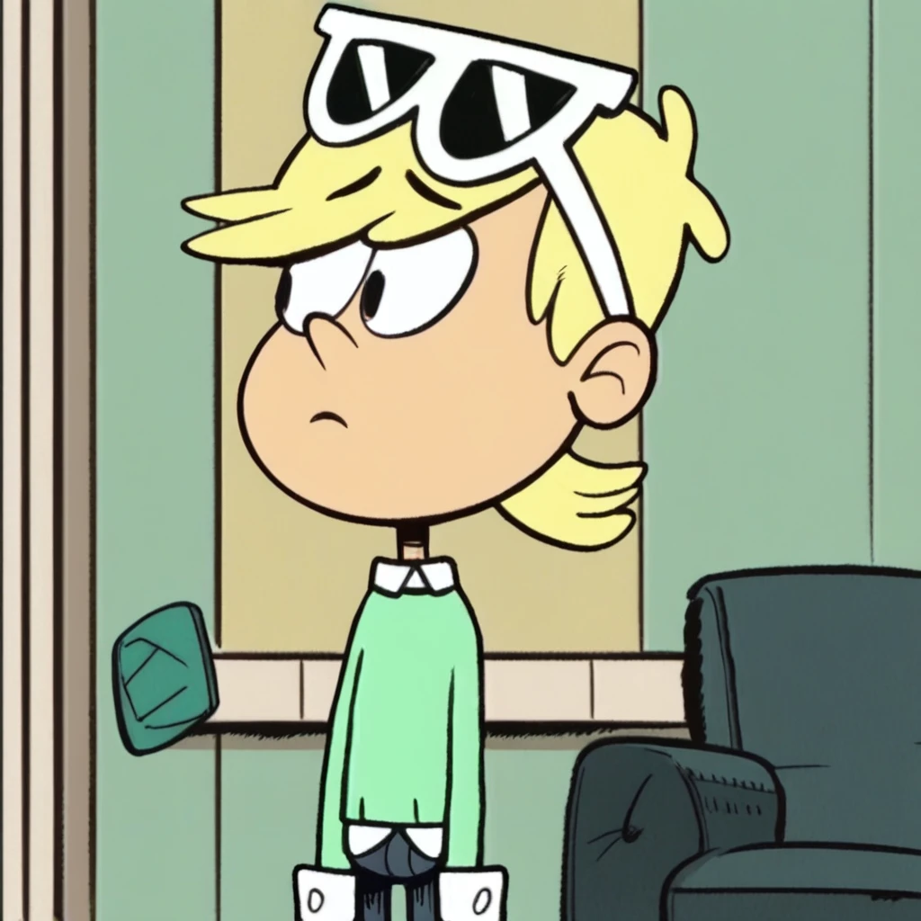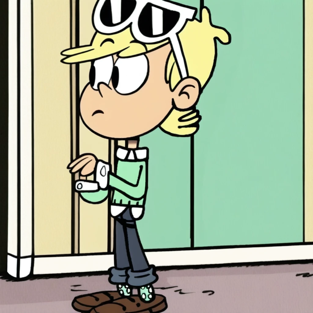 Prompt: Loni loud, solo, 1boy, Blonde hair, short Blonde hair, light Green silk sweater with a white long-sleeved shirt underneath, dark blue jeans, sunglasses, light Green socks with white spots, Brown dress shoes