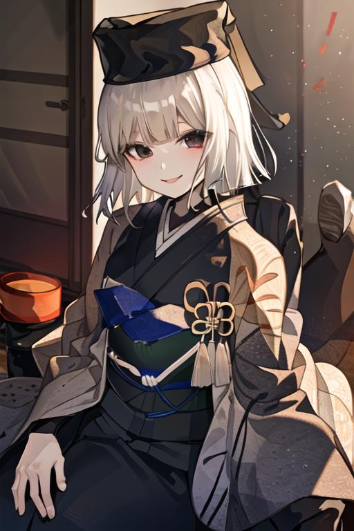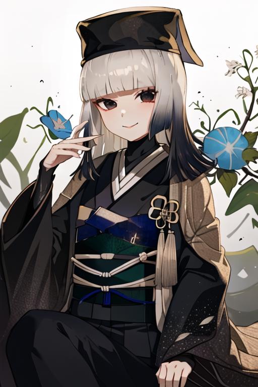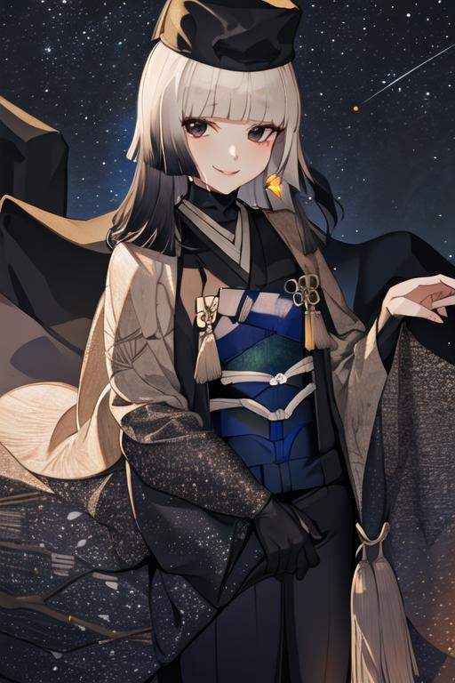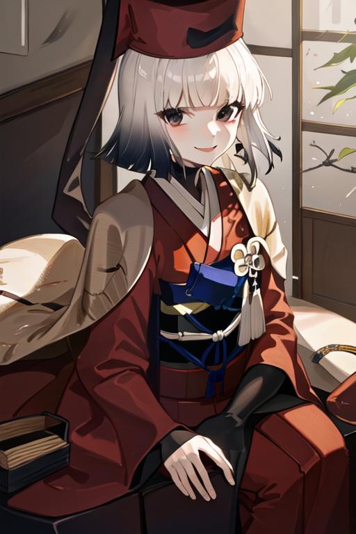 The trigger word is sen_no_rikyu_fgo, and the recommended tags are best quality, masterpiece, highres, solo, {sen_no_rikyu_fgo:1.15}, bangs, blunt_bangs, hat, black_eyes, black_hair, medium_hair, gradient_hair, grey_hair, multicolored_hair, black_headwear, tassel, smile, small_breasts, breasts.