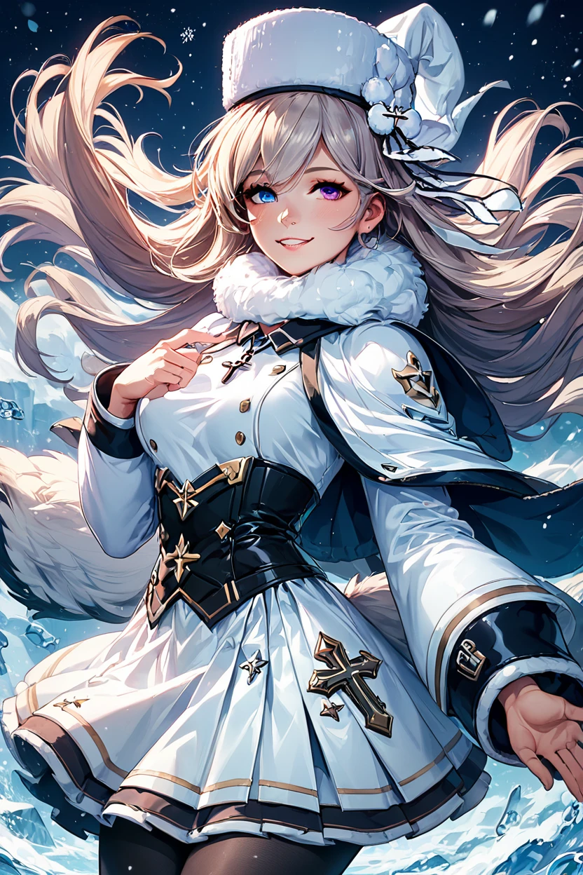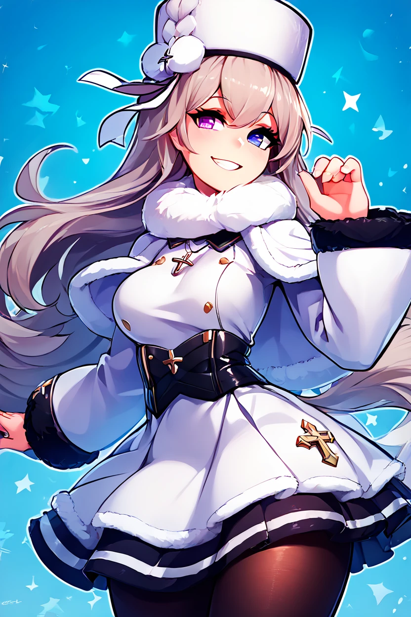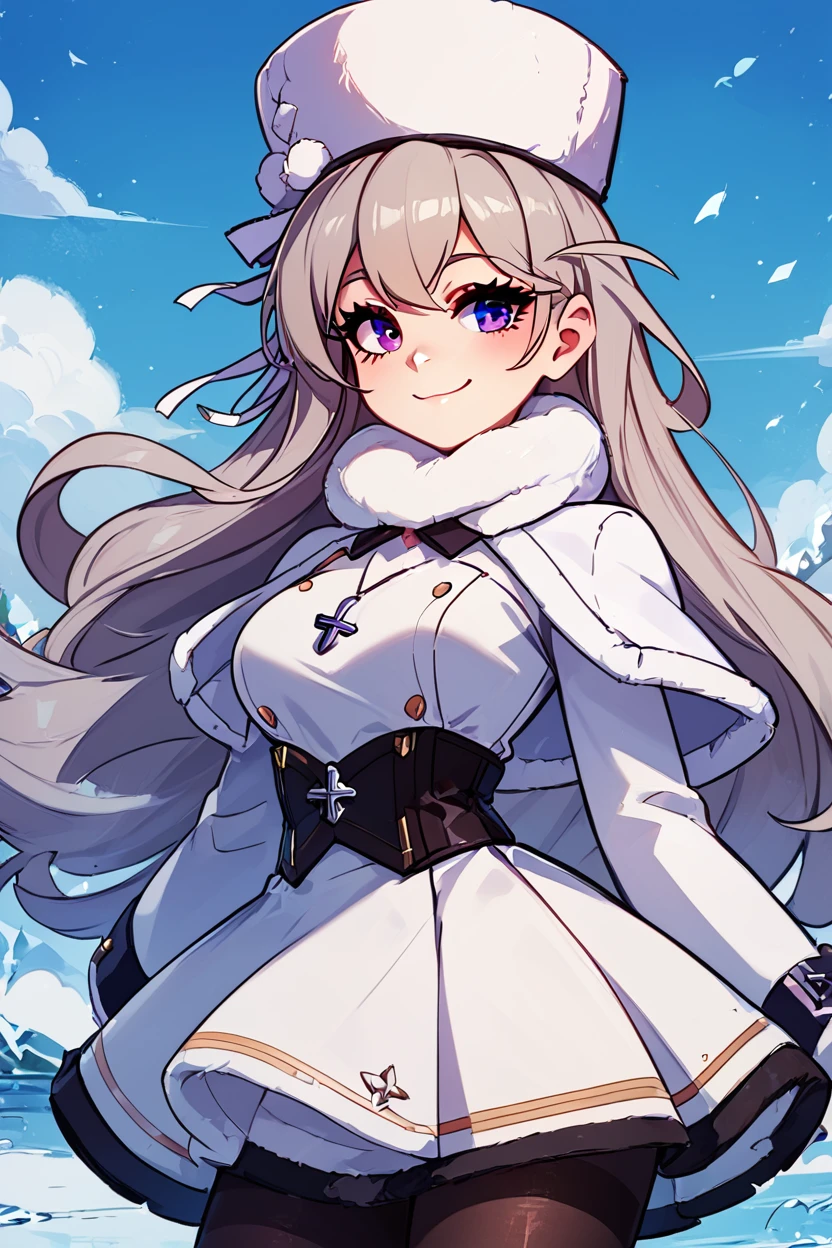zzMurmansk, long hair, purple eyes, heterochromia, blue eyes, bangs, grey hair, hat, white headwear, cross necklace, fur-trimmed dress, white dress, papakha, black pantyhose, long sleeves, black belt, white coat, capelet, winter coat,