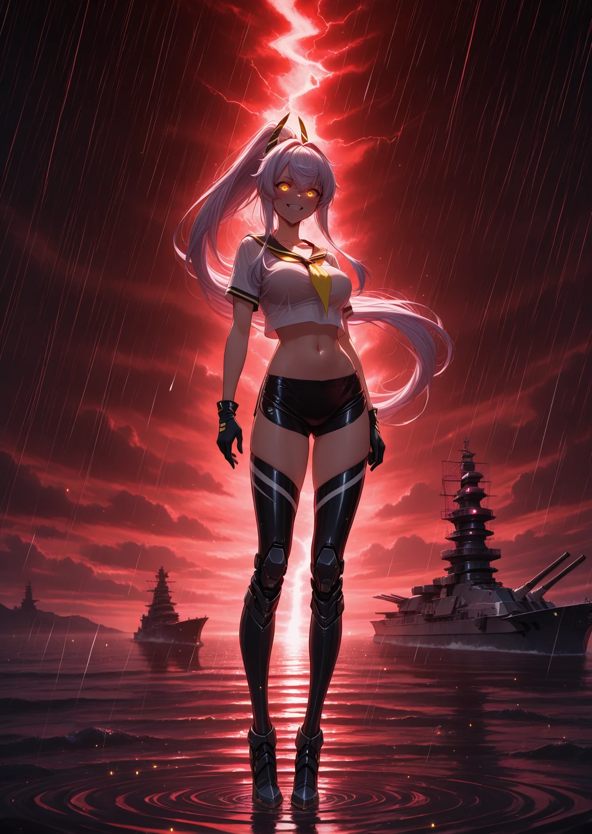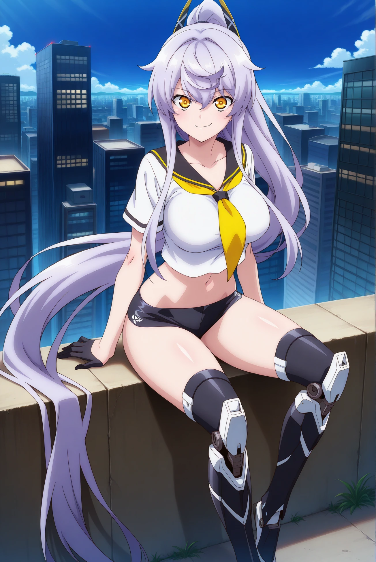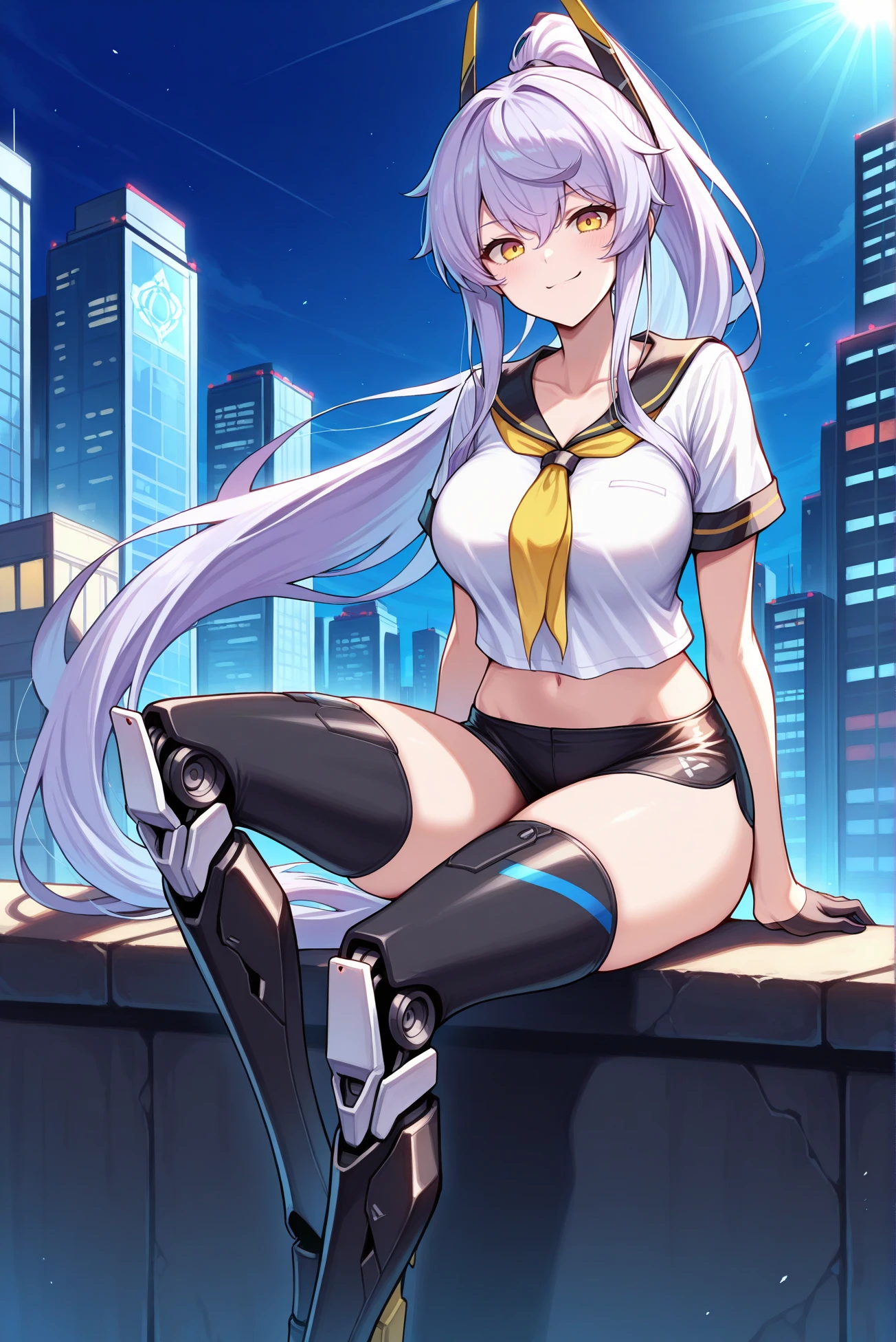 Outfit: crop top, black sailor collar, yellow neckerchief, black micro shorts, black gloves, half gloves, white shirt, mechanical legs