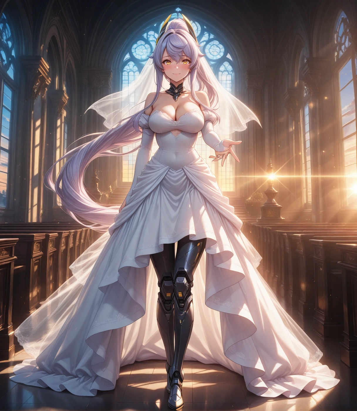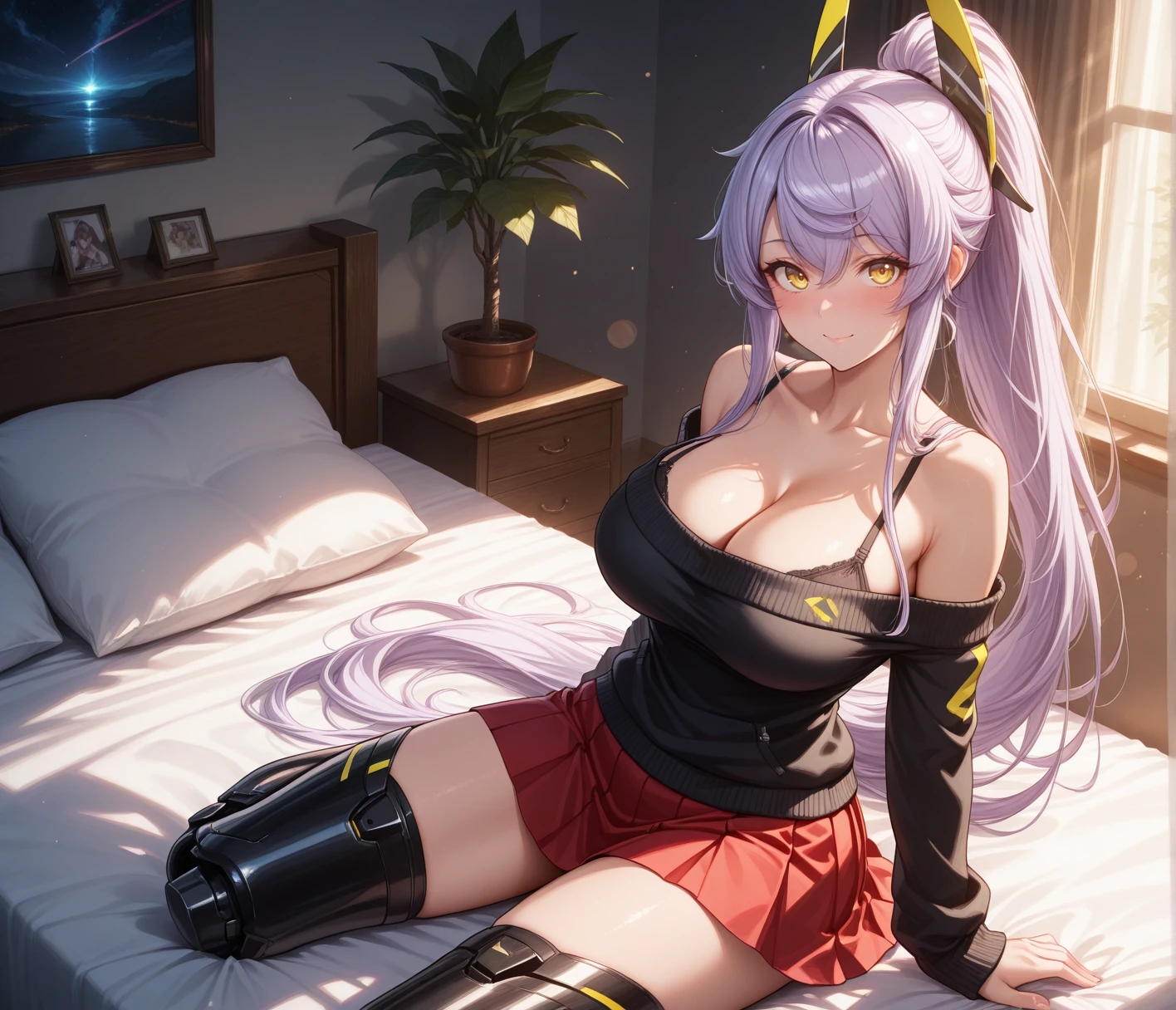 Character: light purple hair, very long hair, yellow eyes, headgear, high ponytail