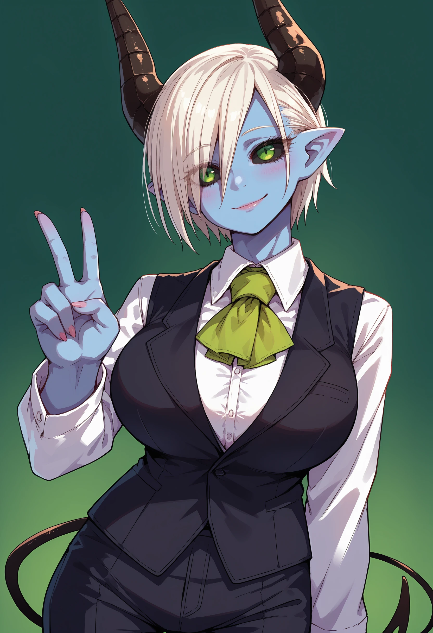 Trigger: wrnchteresamazha, pointy ears, demon girl, demon horns, black horns, blue skin, huge breasts, black sclera, green eyes, white hair, short hair, hair over one eye, eyes visible through hair, demon tail
