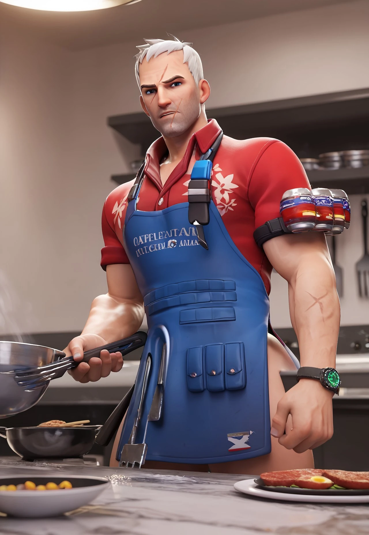 • To generate Grillmaster : 76 art - soldier: 76 \(overwatch\), classic76, short hair, white hair, blue eyes, clean shaven face, scar on face, hawaiian shirt, red shirt, blue apron, brown short, white socks, sandals, purple sunglasses
