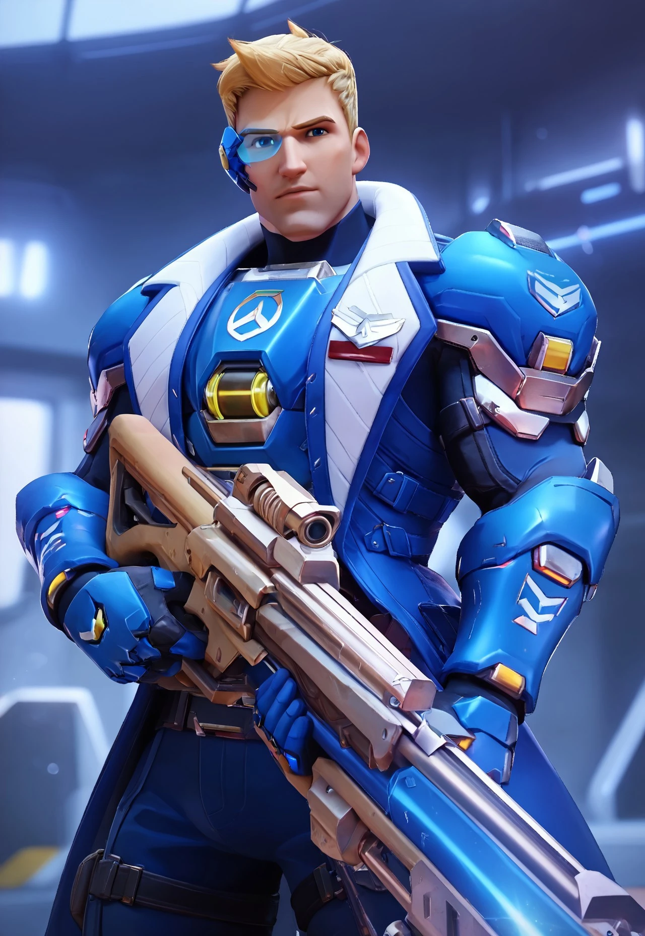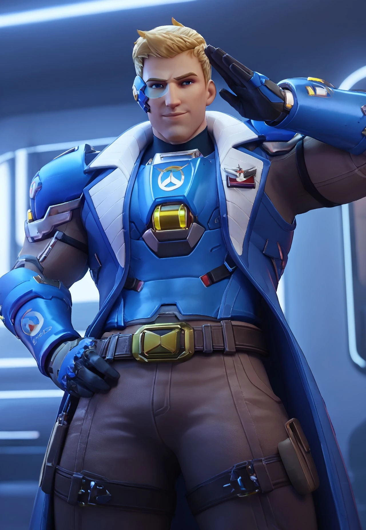 • To generate Strike Commander Morrison art - soldier: 76 \(overwatch\), jackm, short hair, blonde hair, blue eyes, sideburns, armor, coat, blue gauntlet, pant, boot, gloves, scouter