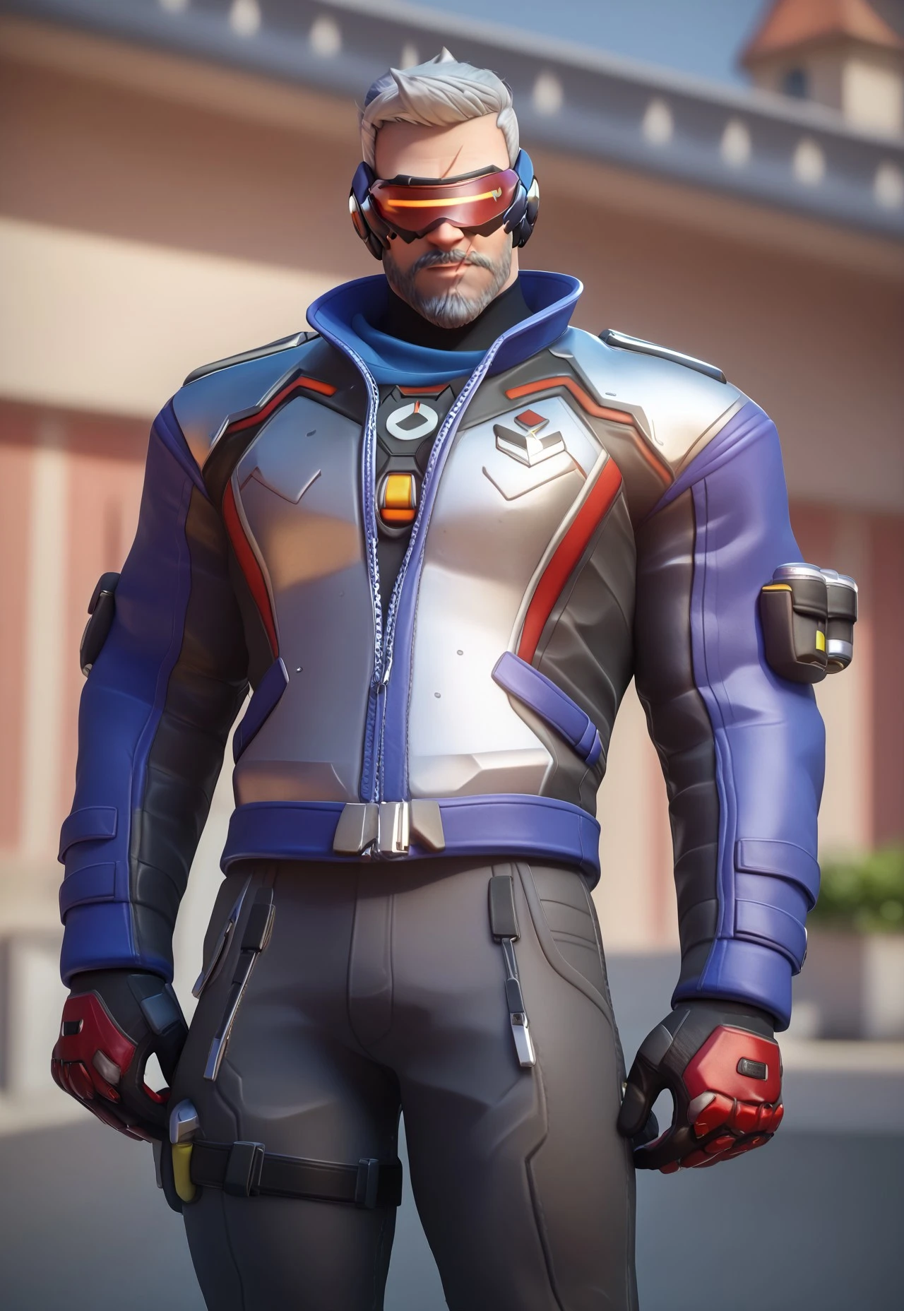 • To generate Overwatch 2 Soldier : 76 art - soldier: 76 \(overwatch\), new76, very short hair, white hair, blue eyes, facial hair (stubble), mustache, scar on face, jacket, black pant, gloves, boot, visor