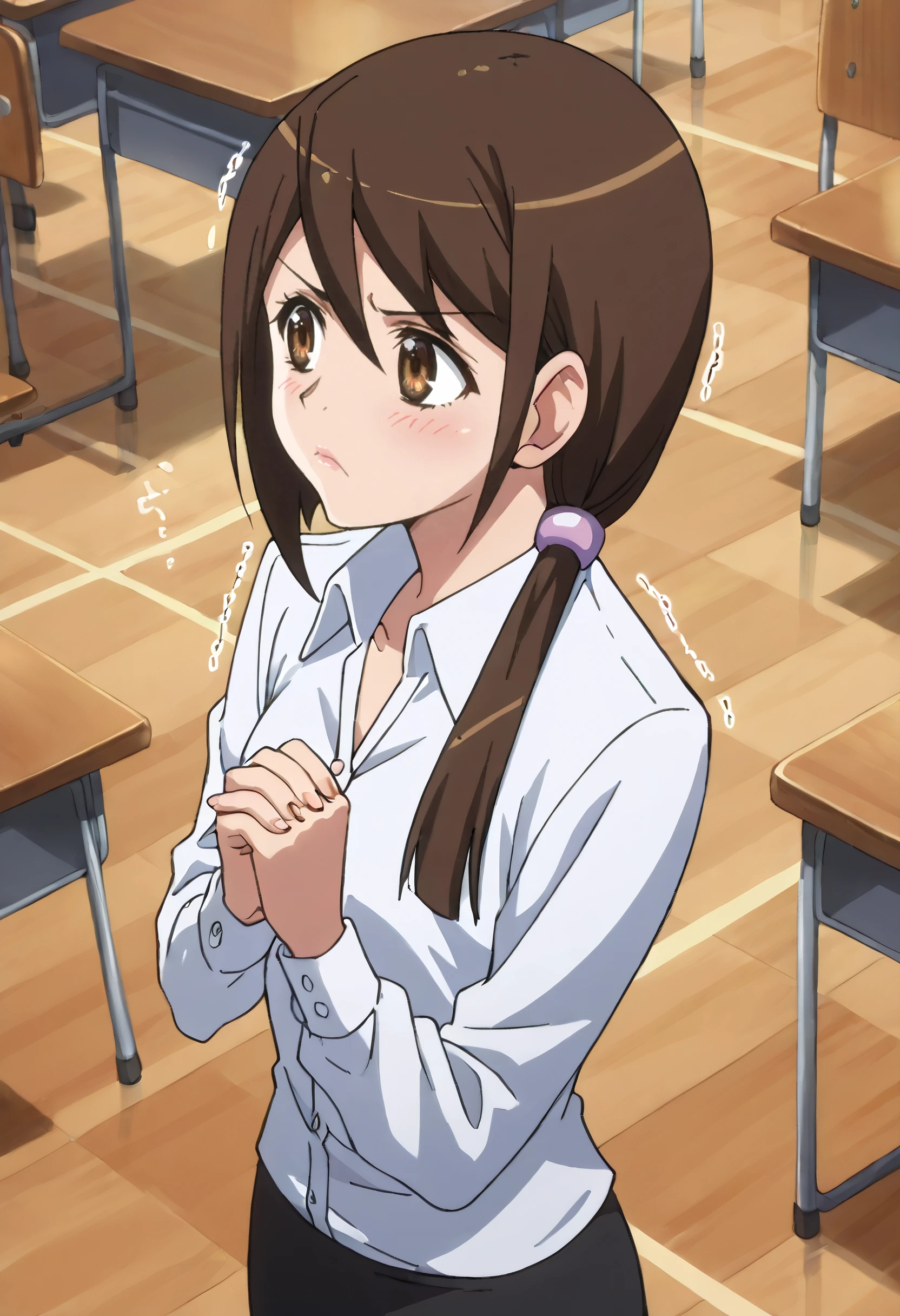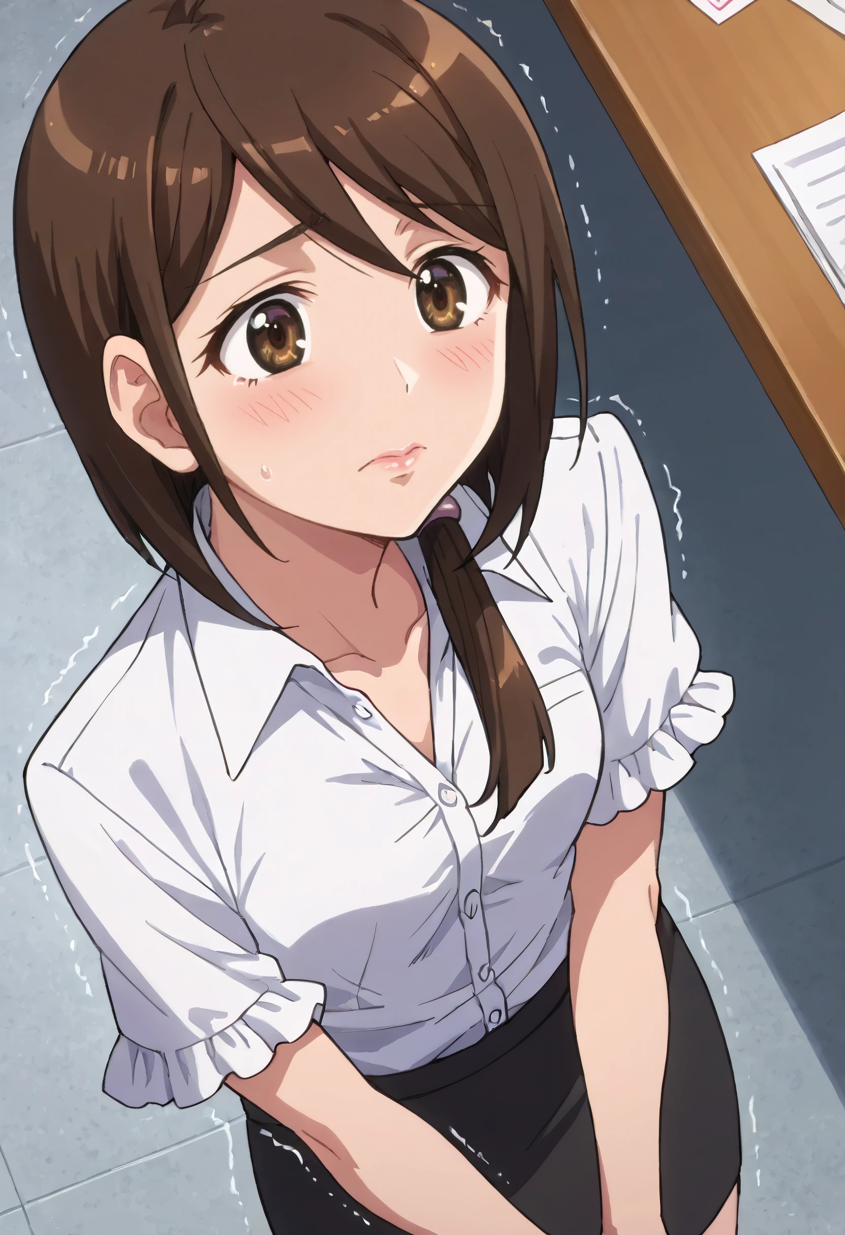 JunSchool, shirt, dress shirt, white shirt, long sleeves, collared shirt, scrunchie, teacher, skirt, pencil skirt, hair ornament, black skirt, open shirt, hair scrunchie,
