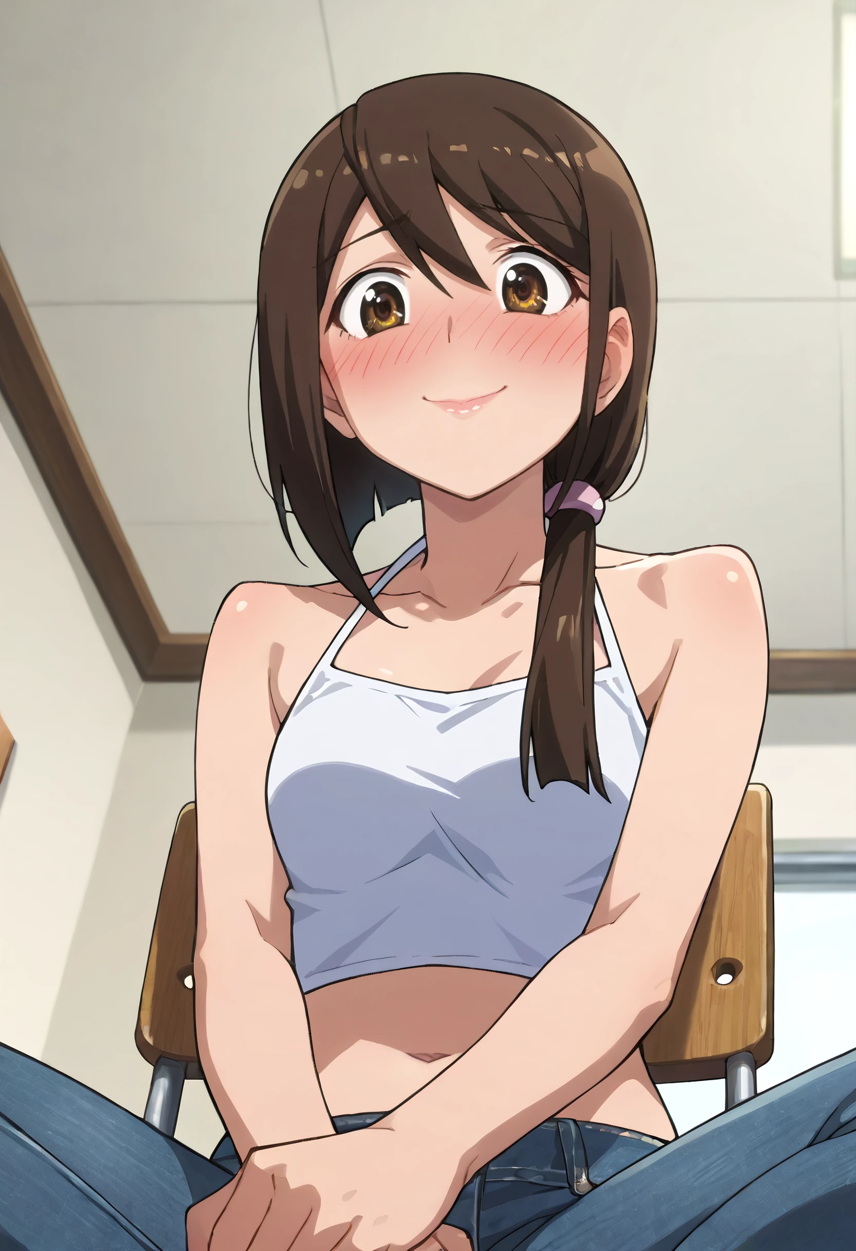 KNZJun, brown hair, brown eyes, long hair, hair over shoulder, ponytail, low ponytail, side ponytail, hair between eyes,