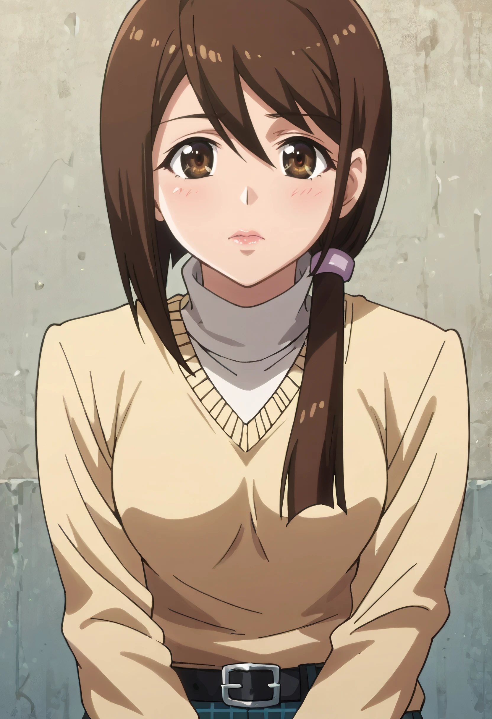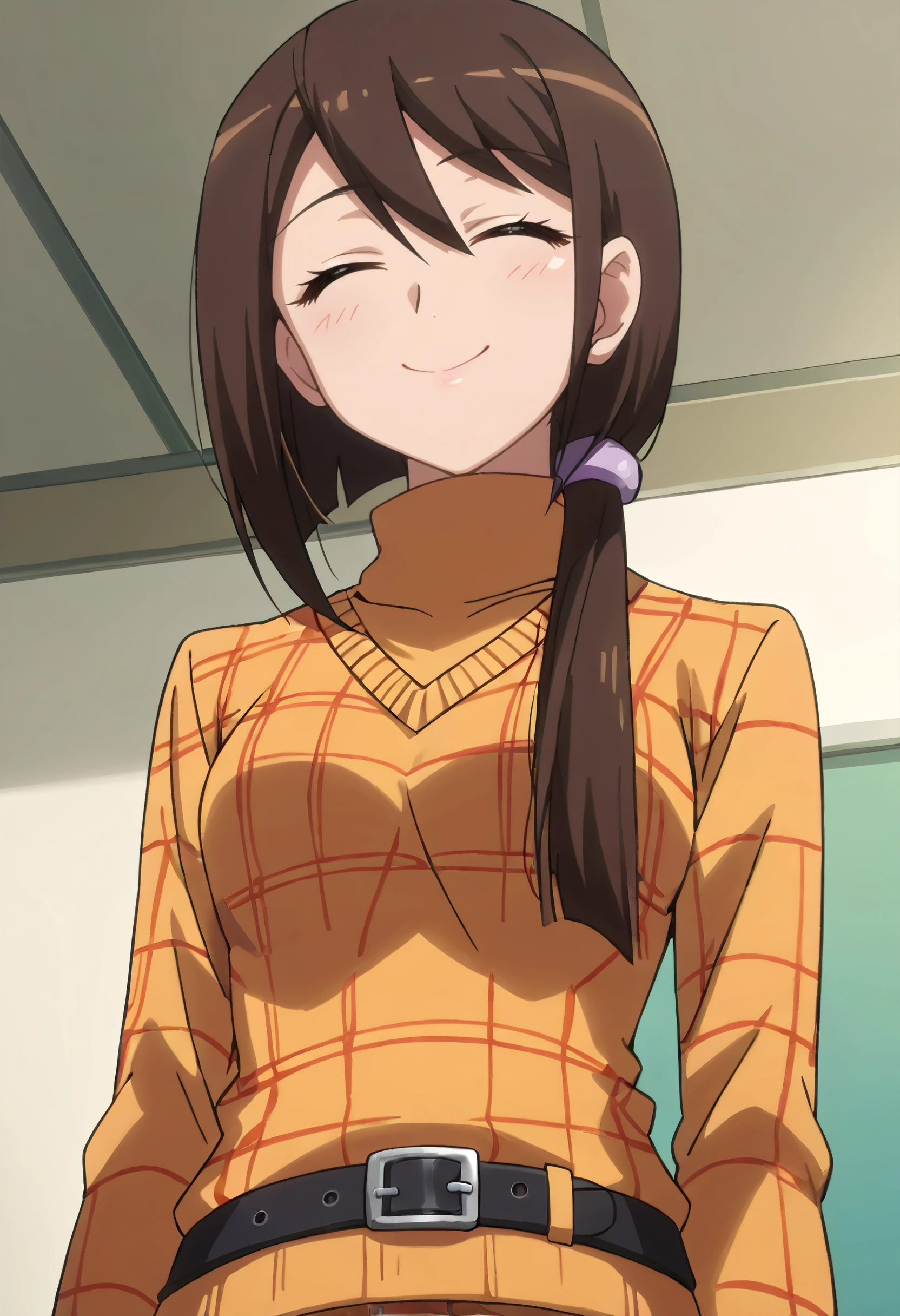 JunSweater, turtleneck, long sleeves, sweater, casual, belt, shirt, black belt, buckle, hair scrunchie, scrunchie, plaid shirt,