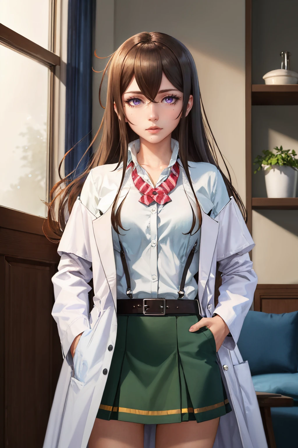 Default Outfit: labcoat, shirt, green skirt, belt