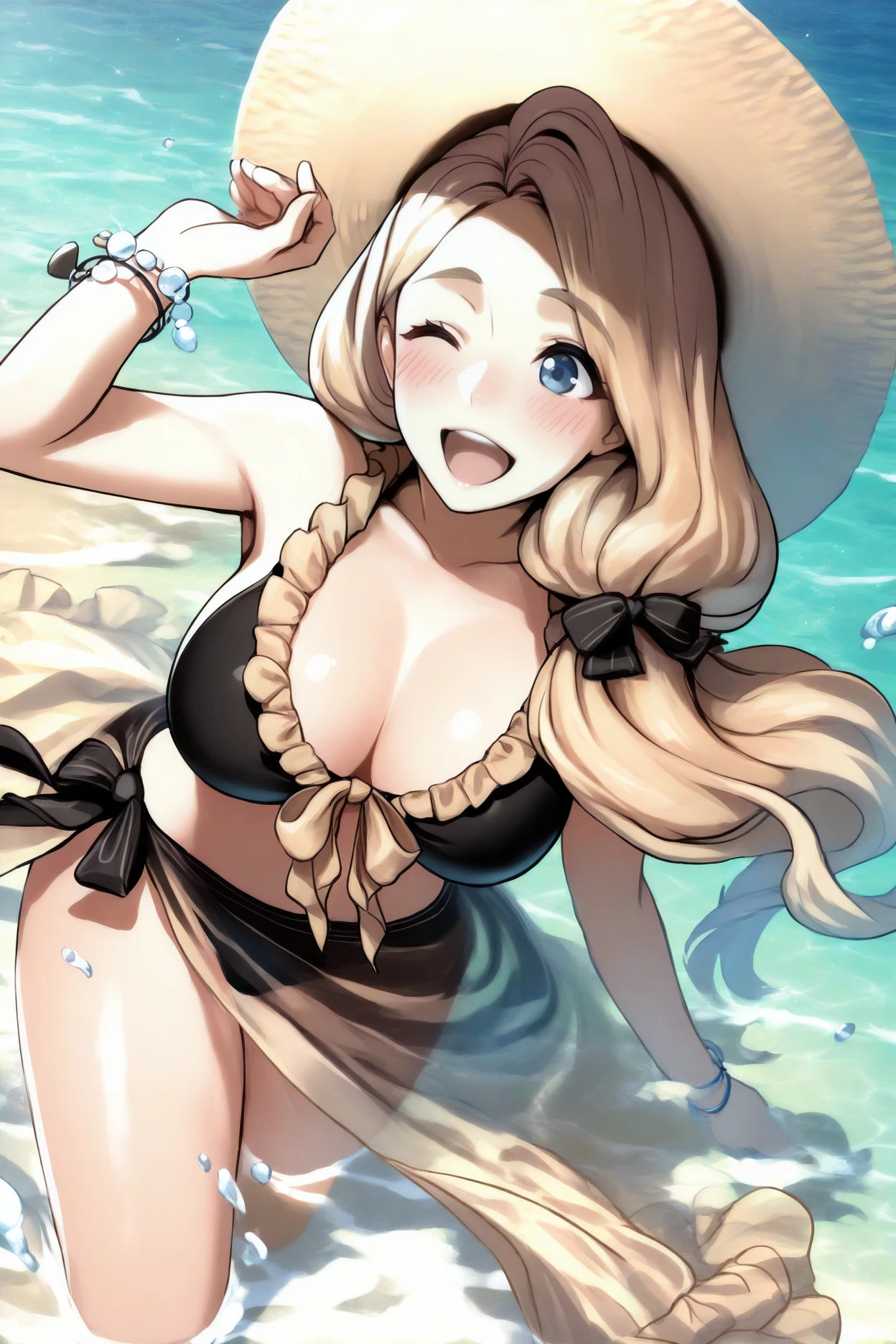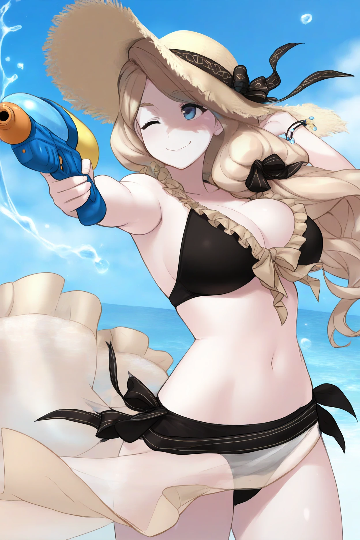 Add "smmcdes, blonde hair, low-tied long hair, blue eyes, hair over shoulder, sun hat, black bikini, frilled bikini, sarong, bracelet" for Summer Mercedes.