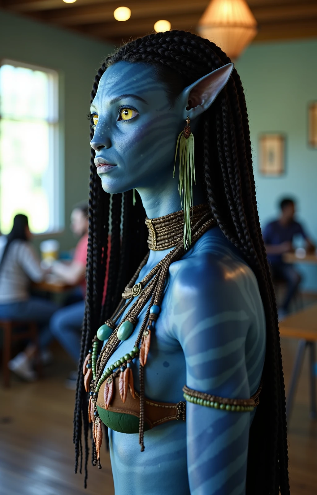 85mm canon lens, photography, photorealistic photo,realistic,elf ears, blue skin, fluxneytiri, pointy ears, solo, colored skin, jewelry, long hair, earrings, black hair, freckles, breasts, yellow eyes, tribal, yellow eyes, looking viewer, day time, blue nail, (bikini:1.5),dreadlocks, from back, ass, indoor, room, cafeteria, food, blue tail
