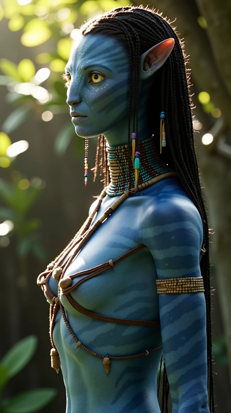 trigger:photorealistic photo,realistic,elf ears, blue skin, fluxneytiri, blue tail