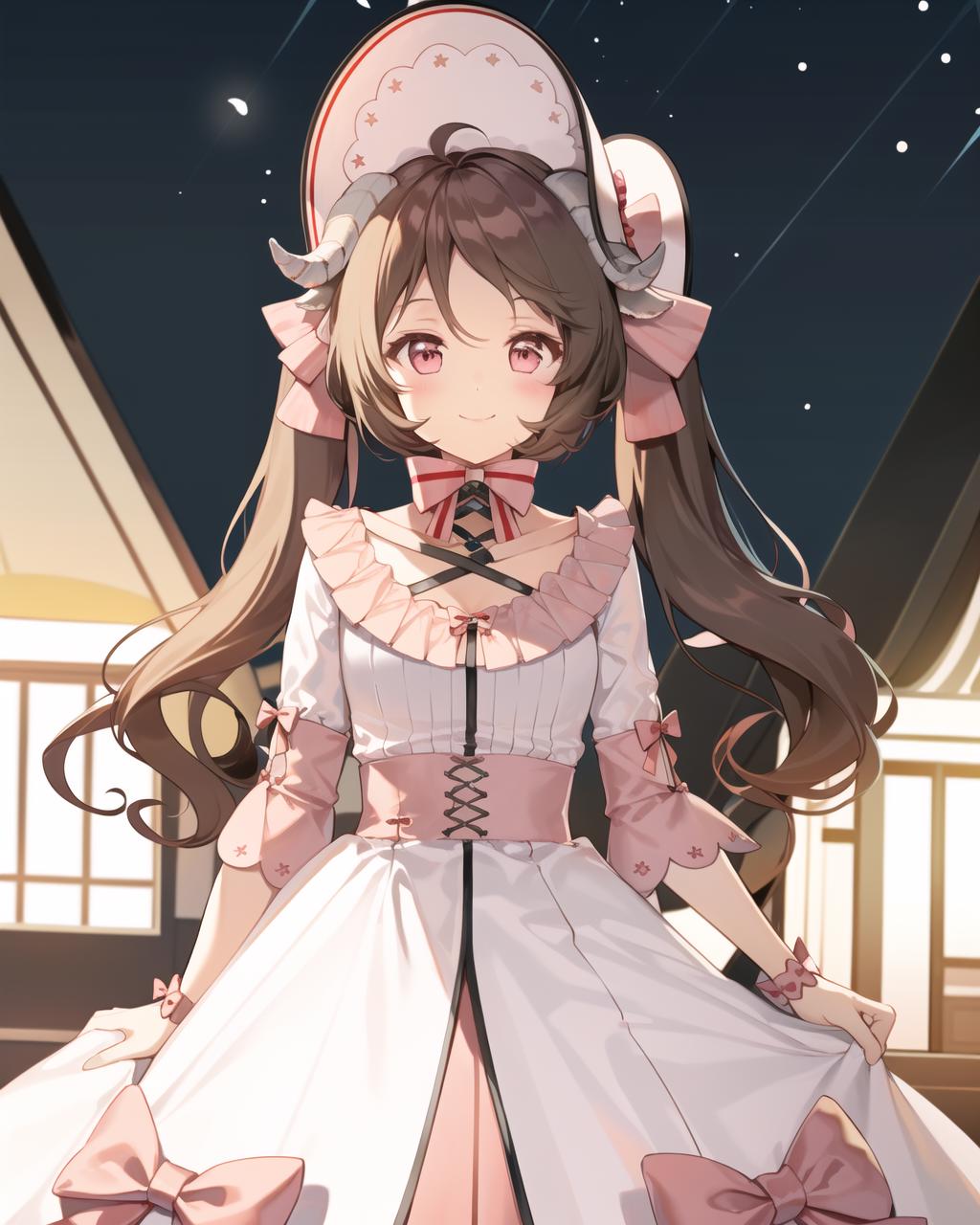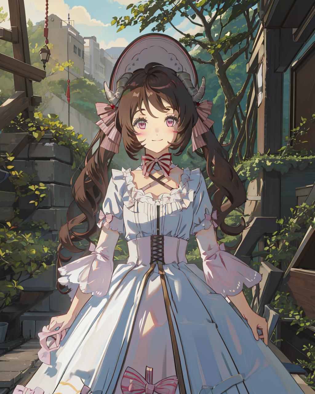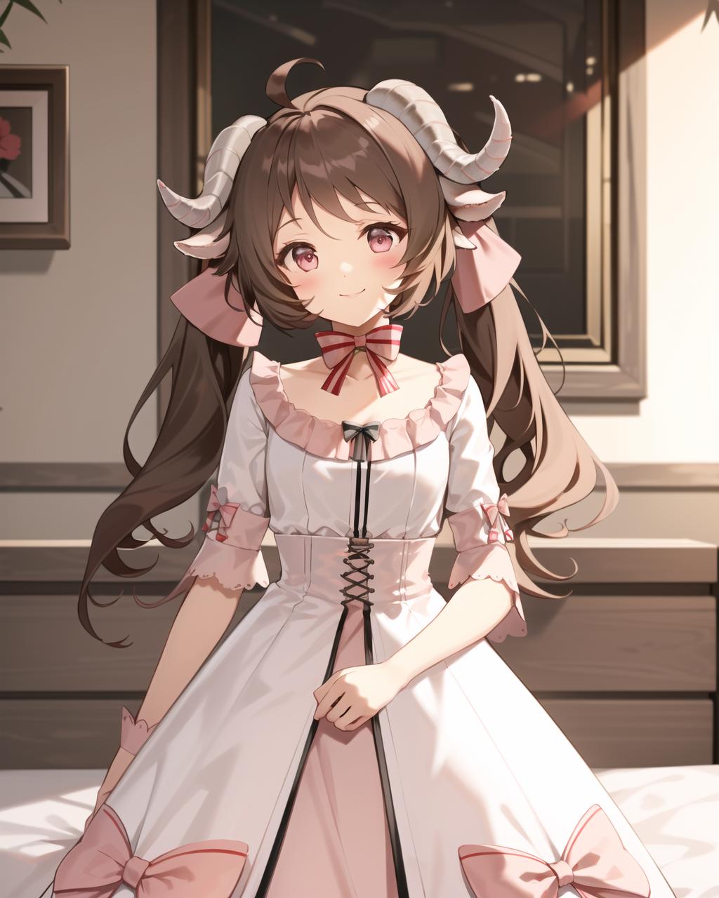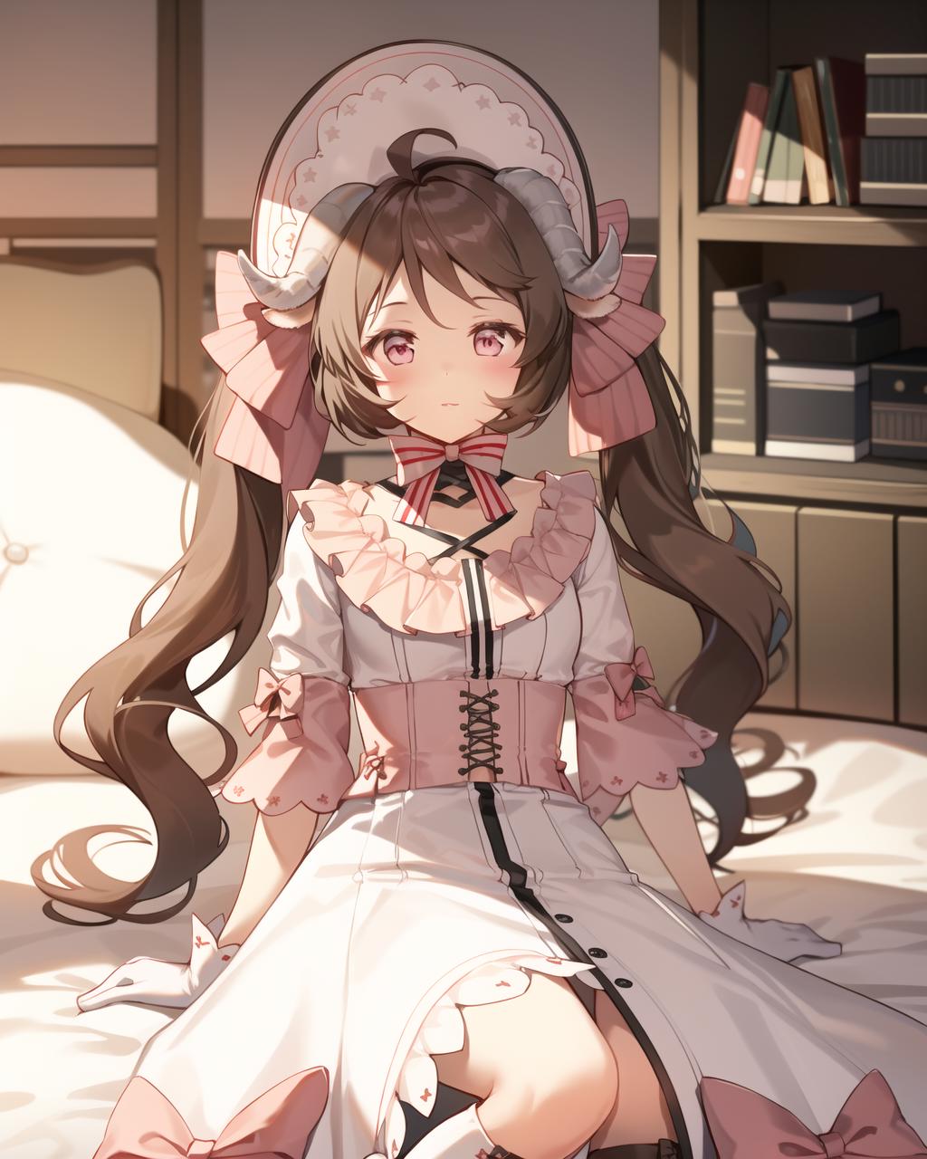 Recommanded tag:1girl,sheep horns,sheep ears,brown hair,twintails,long hair,looking at viewer,ahoge,blush,pink eyes,dress,bonnet,white dress,bow,white headwear,frills,hair bow,short sleeves,white socks,knee boots,kneehighs