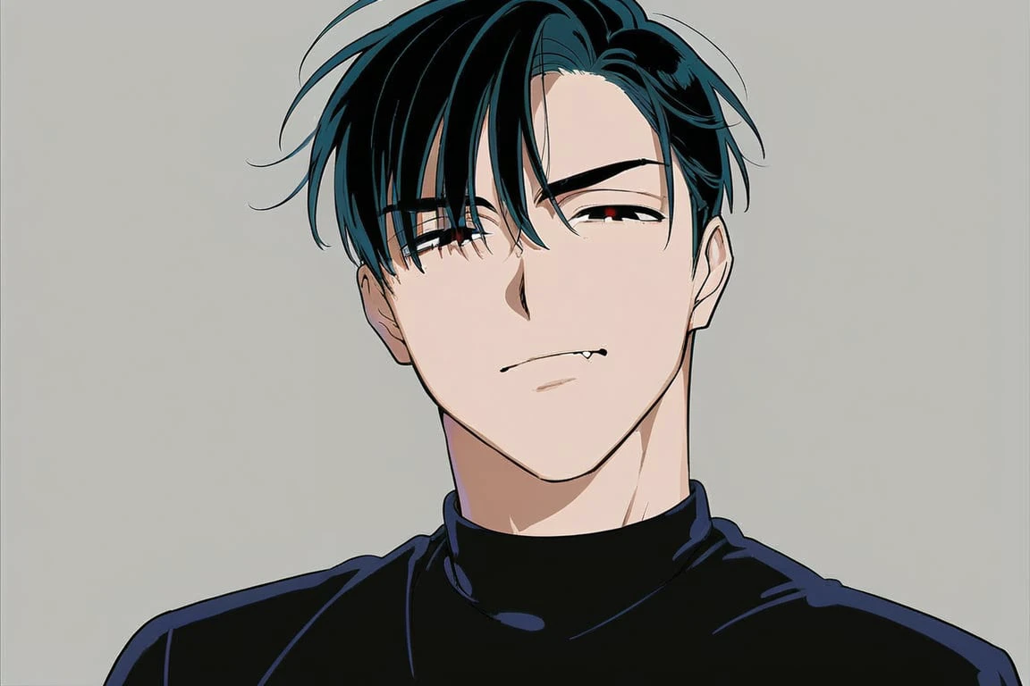 Ivan_ALST, black hair, black eyes, red eye pupils, fang