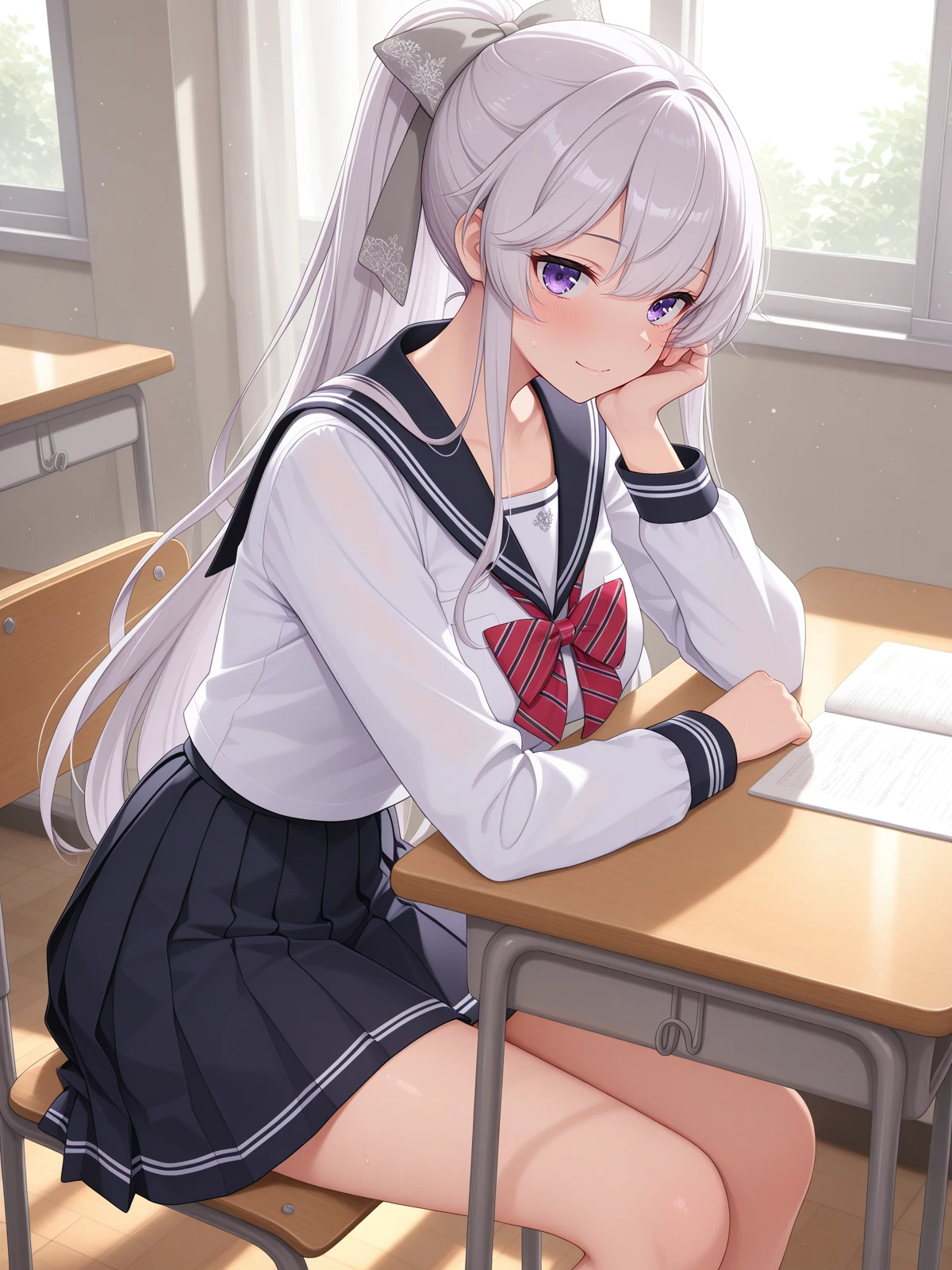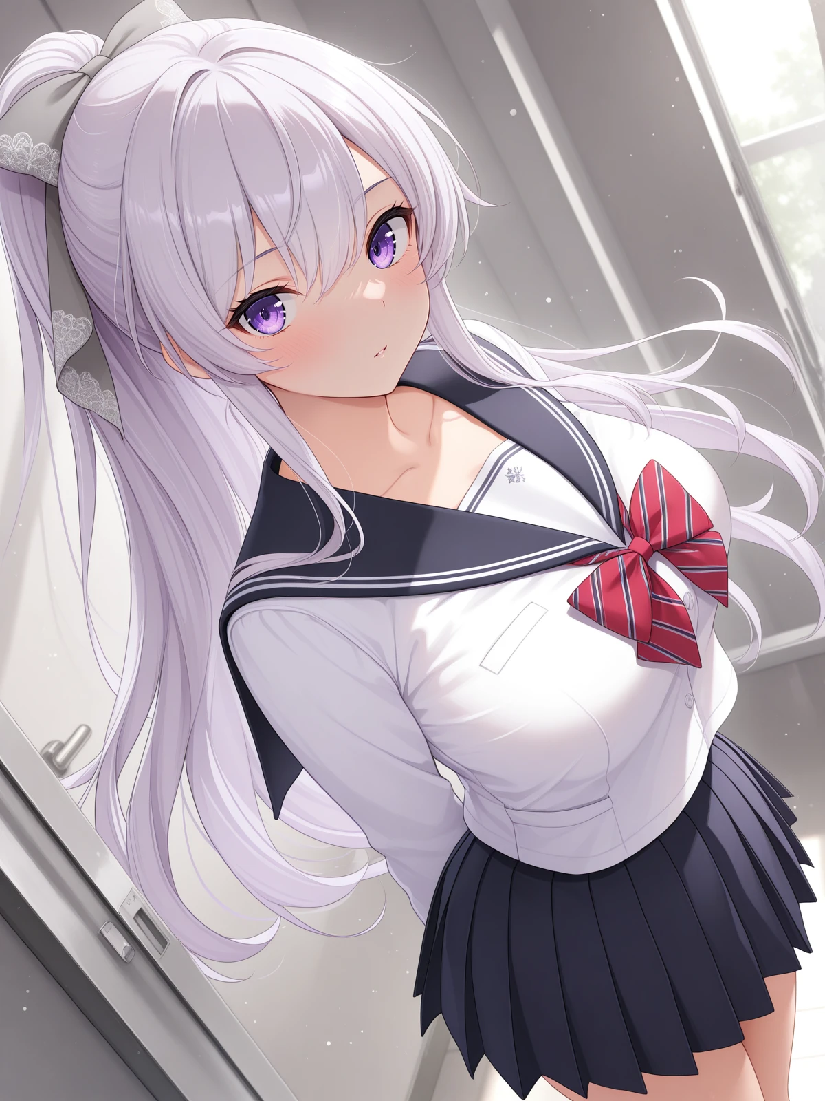 katsuragi shion, purple eyes, grey hair bow,