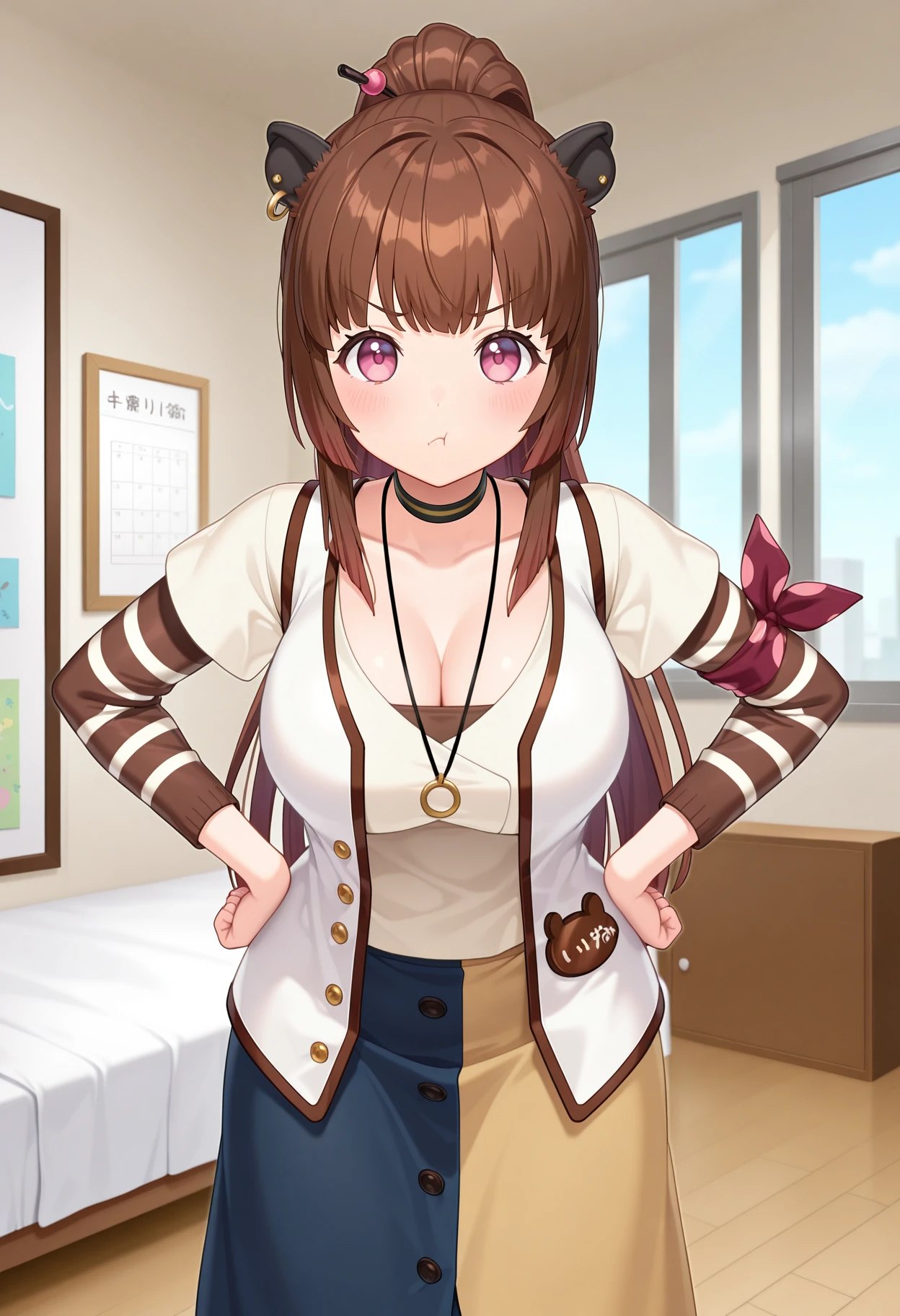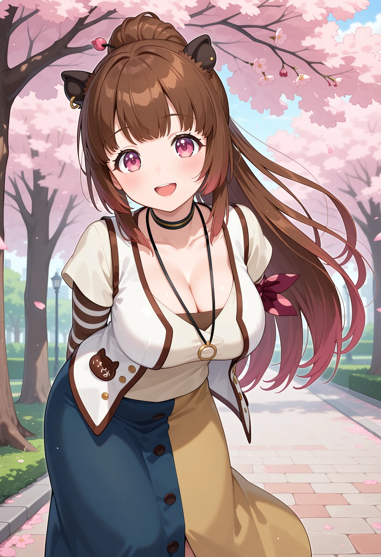 bbizumi, long hair, brown hair, ponytail, animal ears, pink eyes, choker, necklace, cleavage, white shirt, white vest, short over long sleeves, striped sleeves, long skirt, multicolored skirt